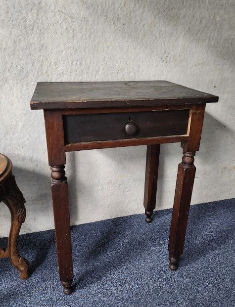 19th century side table/end table with one drawer featuring dovetailed joints. Beautifully turned legs. Wood Type: Cherry Color: Reddish-Brown Features: One drawer Markings: Unmarked