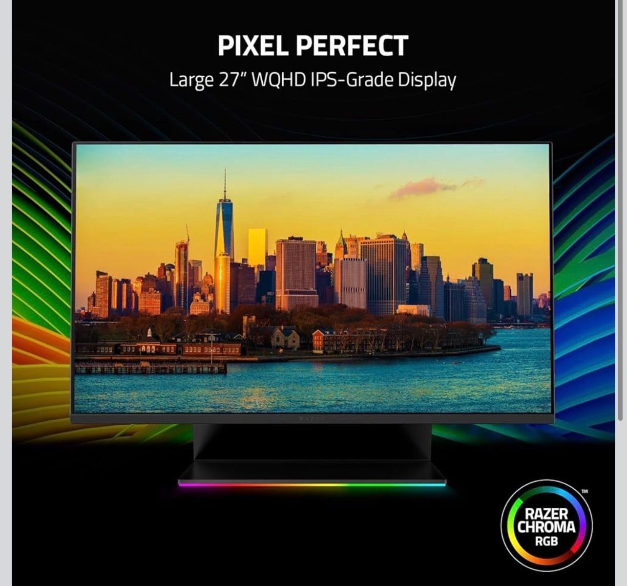 Razer Raptor 27" Gaming Monitor: WQHD (2560x1440) - IPS-Grade - 144Hz - 1ms Response - HDR 400 - NVIDIA G-Sync Compatible & AMD FreeSync - Solid Aluminum Base Chroma RGB - 4Flat Cables in Box Excellent condition. Pick up in Thousand Oaks only.