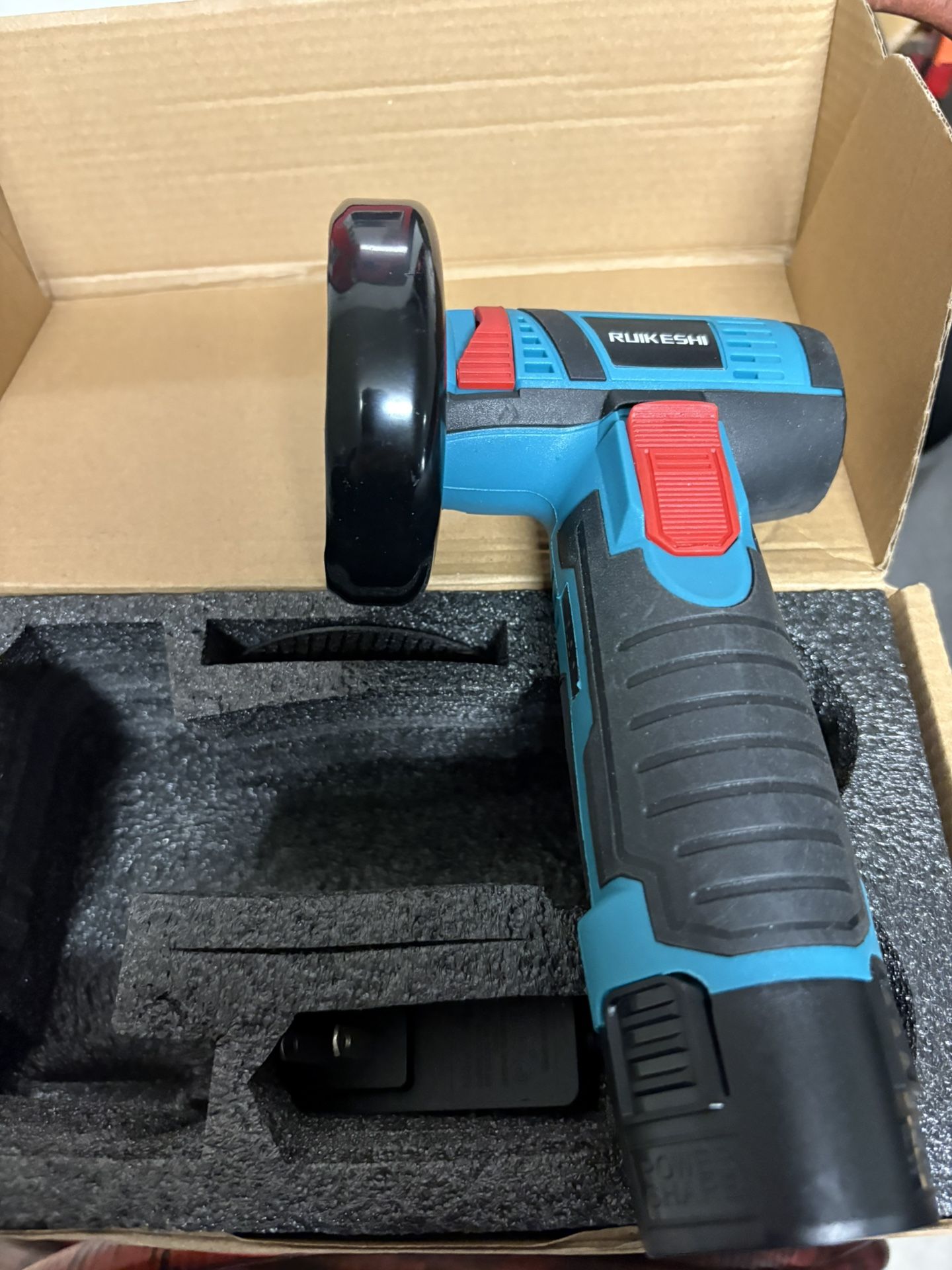 Brand new in the box portable angle grinder with the battery 16 volt and the charger and extra disc $45 Ann and rainbow