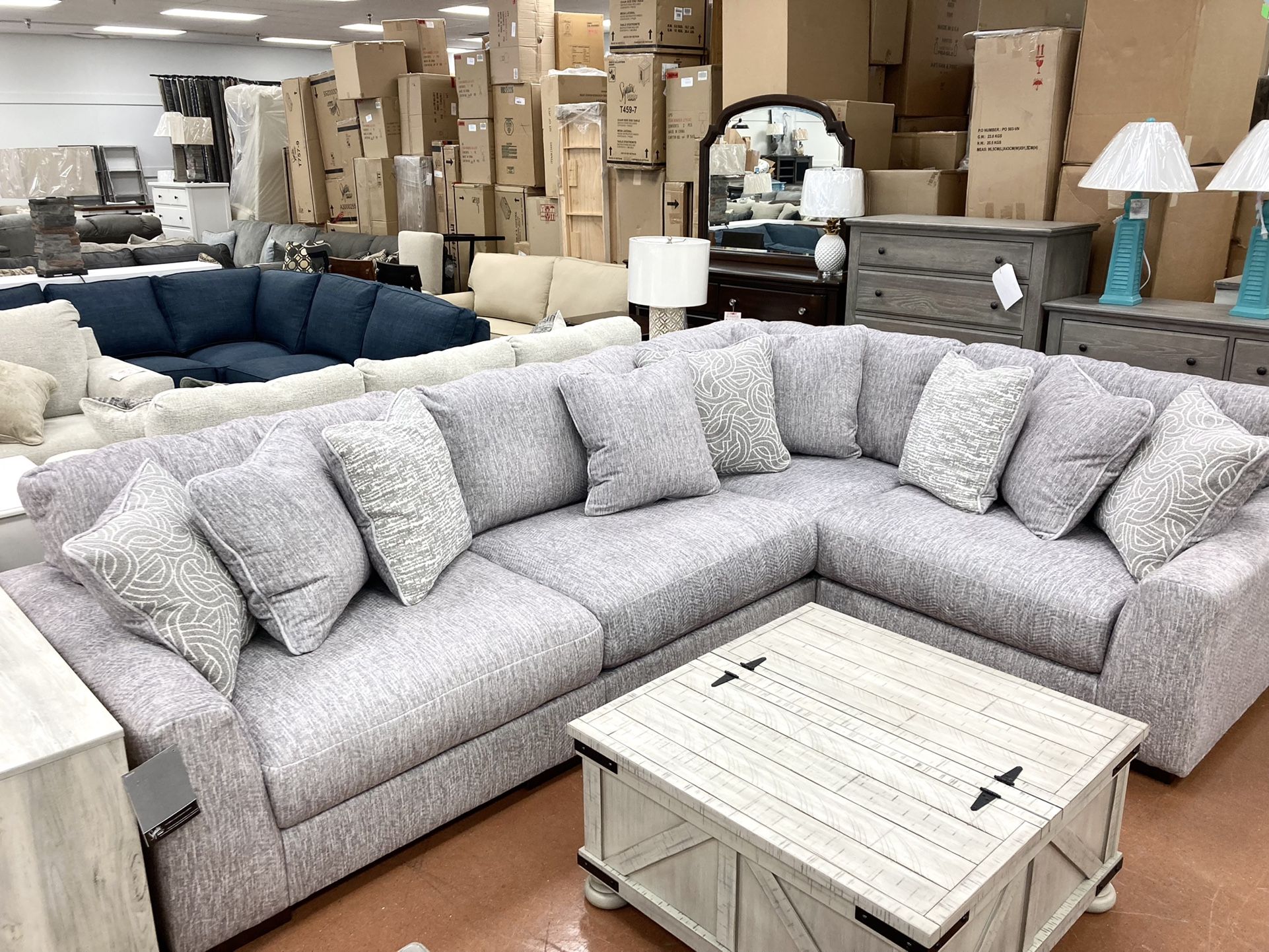 New Sectional - $1999 Ultra Plush Extra Deep Seating Ultra Soft Grey Fabric w/Accent Pillows 132” x 92” x 44” Depth (as Shown) Modular Styling- Can order Larger! In Stock - Take it Home!! Rock’s Carolina Furniture 2356 Virginia Beach Blvd Virginia Beach, VA 23454 (next to TJ Maxx @ London Bridge) Open 10 to 7 Monday - Saturday Open 10 to 5 Sunday