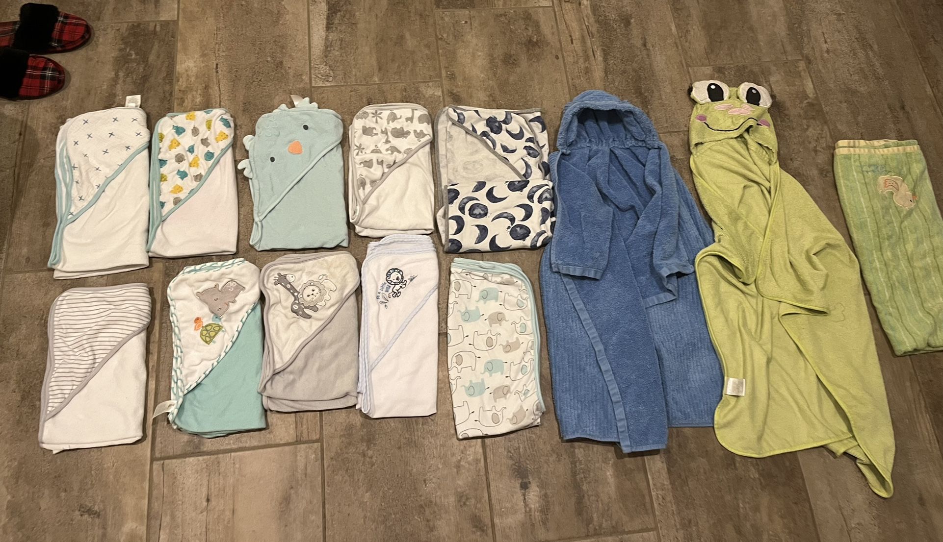 Baby boy hooded towel , there are 13 pieces total all in great condition, asking for $20, will hold for Venmo Also have other baby clothes and other stuff available on sale,