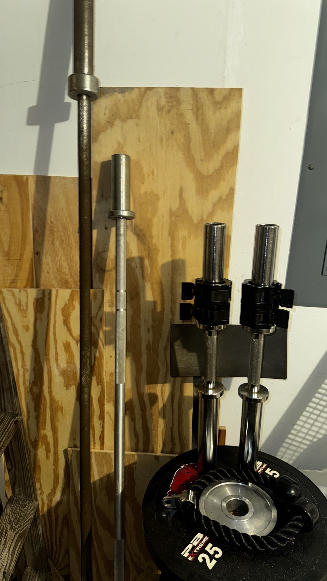 $120 for all. PICKUP ONLY, CASH ONLY OR $60 for the 5ft 25lb barbell $50 for the rusty 7ft 45lb barbell $30 for the dumbbells with clips $20 for the 25lb plate $5 for the tricep rope