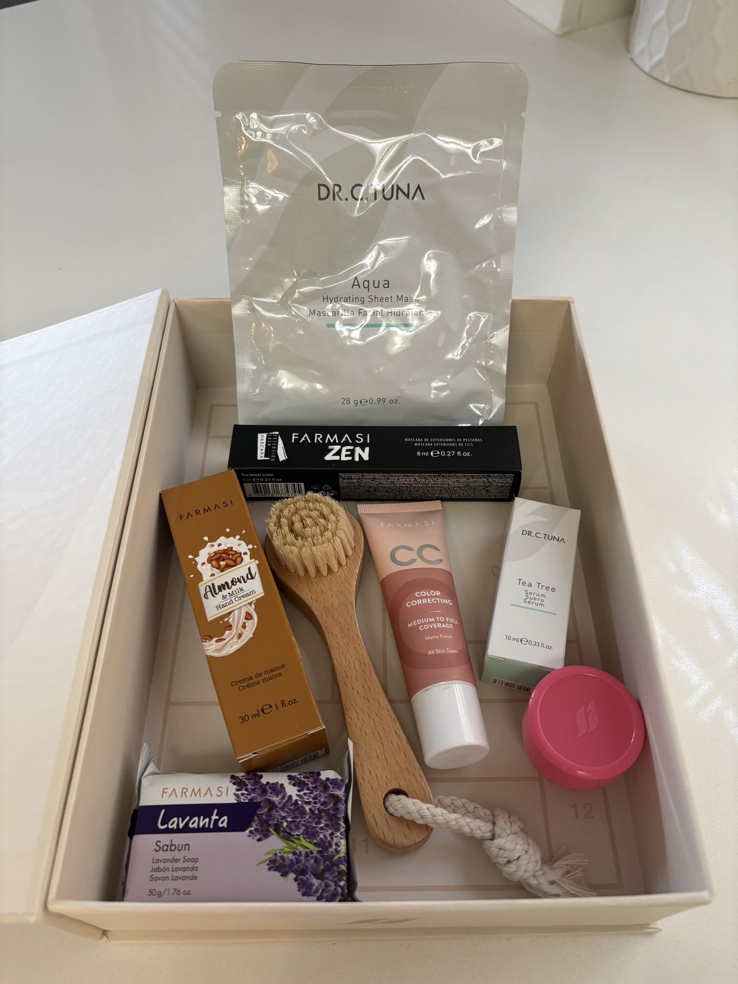 A variety of Farmasi products such as mask, facial brush, mascara, lip balm, foundation, facial serum, soap and hand cream