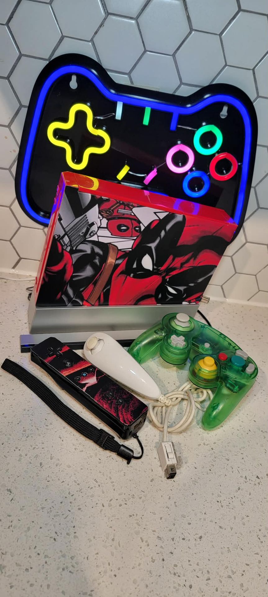 This Nintendo Wii Bundle includes everything that you need to start playing right away. •Nintendo Wii Console •1 Wii Remote •1 Nunchuck •128 GB SD Card (4OOO Games) •Wii Sensor Bar •Power Supply & HDMI Coverter, Not AV like the other Basic ones. this system has a custom Sticker theme on the Wii, great for Famly Fun Enertainment, tons of Retro Games included as well. N64, SNES, NES, Sega GENESIS. I can get any Gamecube/Wii Game. Has Many Mario Games like: Mario 64(Play as Sonic, Wario, Waluigi, Kirby, Crash Bandicoot) Mario Kart 64( Unlocked Characters like Dragon Ball Z, GTA San Andreas Characters, Spongebob Kart 64, Angry Bird Kart 64 & Pokemon Kart 64)