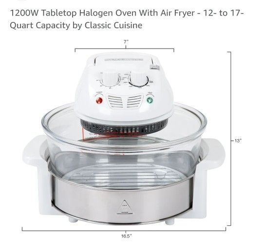 ENERGY-SAVING DESIGN - This 1200W tabletop oven combines innovative halogen, convection, and infrared technologies to cook meals in 25% to 50% less time than a conventional oven. COMPLETE COOKING SET - Use the included stainless steel frying pan, dual cooking racks, lid holder, tongs, and recipe manual to create meals in a variety of cooking styles. Separate dials let you easily control the temperature and cooking timer. GLASS COOKING BOWL - Keep an eye on food while cooking with the convenient 12-quart glass bowl. It's heat-resistant and dishwasher safe for easy cleanup. HEALTHIER MEALS - This air fryer oven lets you cook crispy foods with little to no oil or fats. The steam option also helps to retain the natural flavor, color, and nutrients of your vegetables. PRODUCT DETAILS - Materials: Glass, Stainless Steel, Plastic. Dimensions: (L) 16.5" x (W) 16.5" x (H) 13". Color: White.