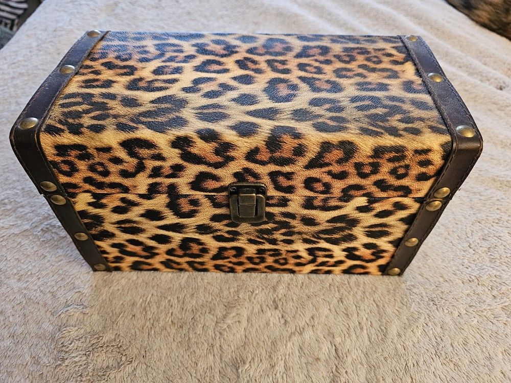 Leopard decor storage mini trunk is so adorable! It is solid and great quality! It is in absolutely perfect condition. The size is perfect for a side table or shelf. 6" L x 11.5 W x 6" H.