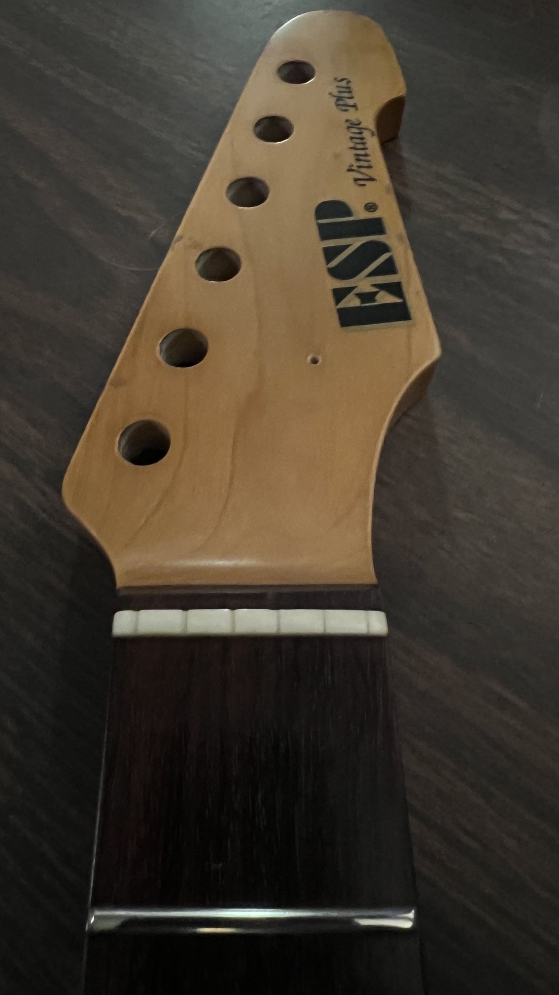 2007 ESP Japan Vintage Plus Strat style neck. All of the necks available that will be listed were detailed, leveled, completely combed over by former Esp custom shop and Artist technician. Easy install as one neck drill hole is off Will fit most strat replacement bodies. I have installed many of these on other replacement bodies. Especially my own. This will fit on most replacement bodies, and having a few of my guitars, equipped with these, they are the most stable and reliable Guitar necks that I have ever used. From NYC in January to Brazil Feb-May. I didn't have much to adjust to be honest because of the reinforcements inside. Then why am I selling this one, Well there's actually four of them. This is one of three vintage plus. 56mm at heel. 320mm / 12" radius. Works surprisingly well with strats equipped with Tune o Matics. Or just well setup. Contact me directly for any info.