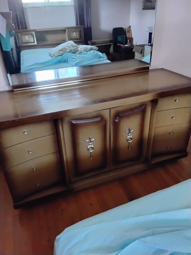 Headboard and footboard, 2 night stands, dresser and chest of drawers. Large dressermirror.