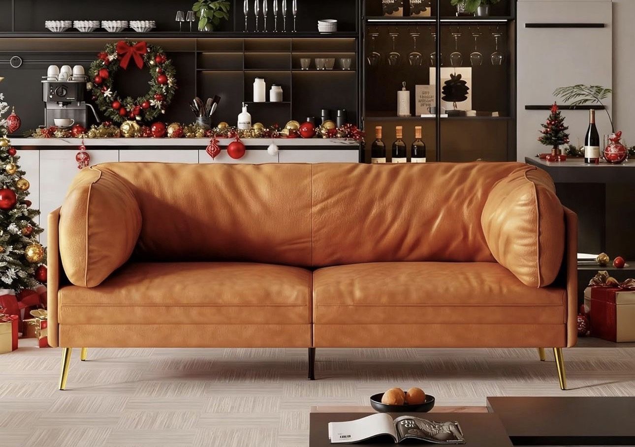 73'' Mid-Century Modern Couch, Small Loveseat, Orange Fabric Solid Wood Frame, Comfy Cushions, Tool-Free Assembly, for Office, Living Room,