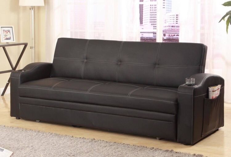 black faux leather folding futon sofa bed with built in cup holders in the arms