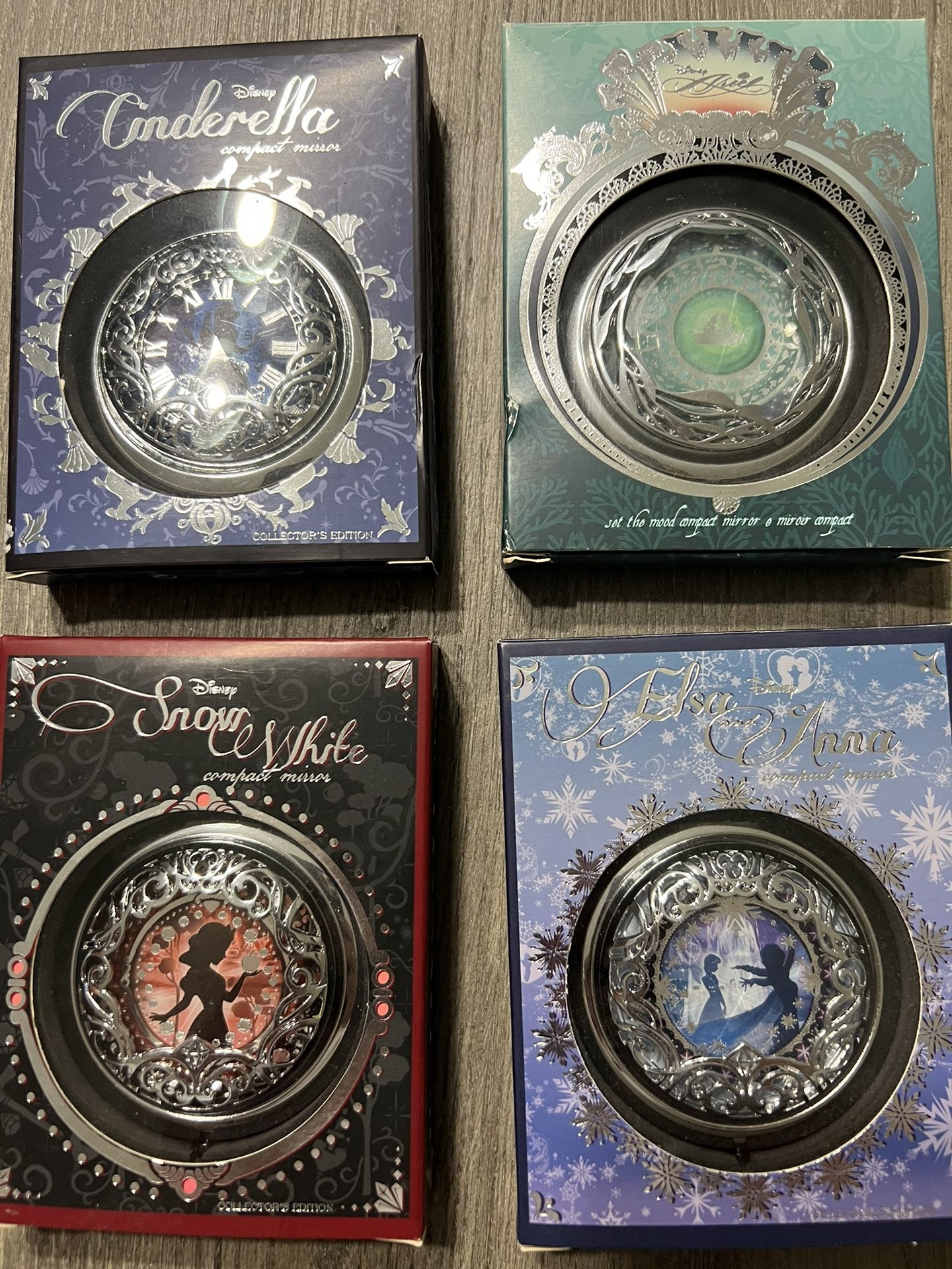 Great for that Disney Fan for the Holidays! Set of 4 Disney Collectible Disney mirror compacts. Snow White, The Little Mermaid, Frozen and Cinderella. New and in original boxes. $100 each or all 4 for $375.