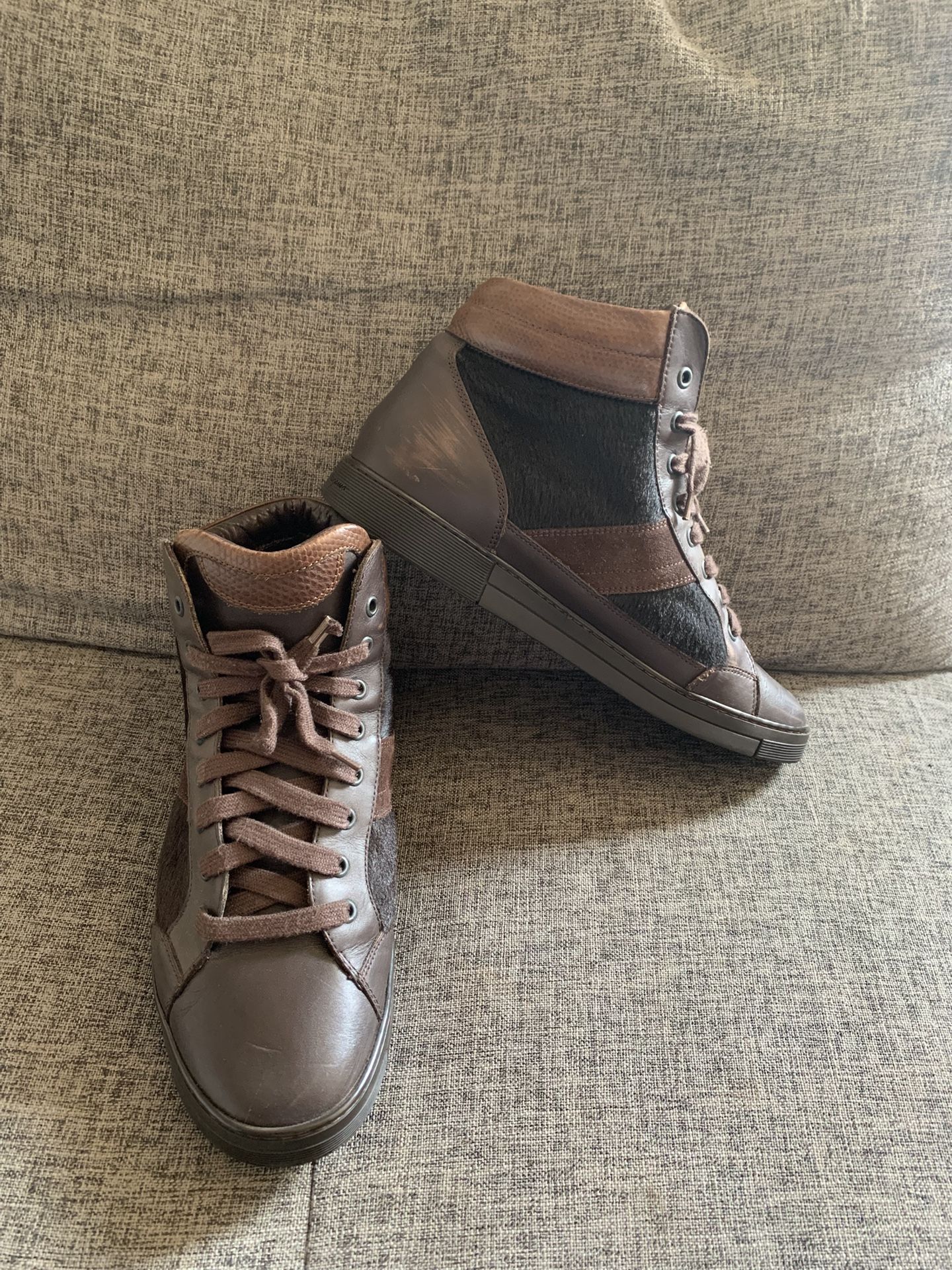 Salvatore Ferragamo Calf Skin and brown leather sneakers Men US size 7.5. In fair condition, no rips or tears just has scuff marks and minor scratches, Doesn't come with the original box. see pictures for more details