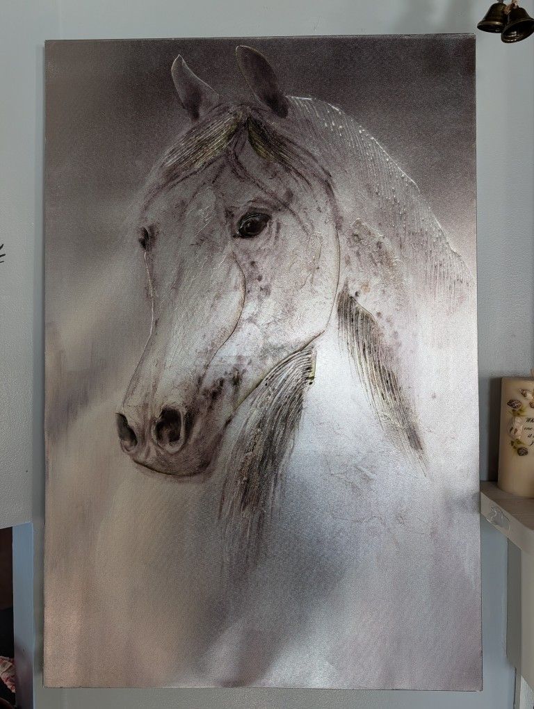 Absolutely gorgeous extra large silver horse canvas on thick wooden frame. Quality piece of wall art. Please refer to photos for measurements. The horse is slightly 3d as well. It has texture to it instead of being completely flat. Coming from a NON cigarette home. So clean and smell free. Asking $50 cash or Venmo. Pickup only sorry no shipping given it's size. First come first serve.