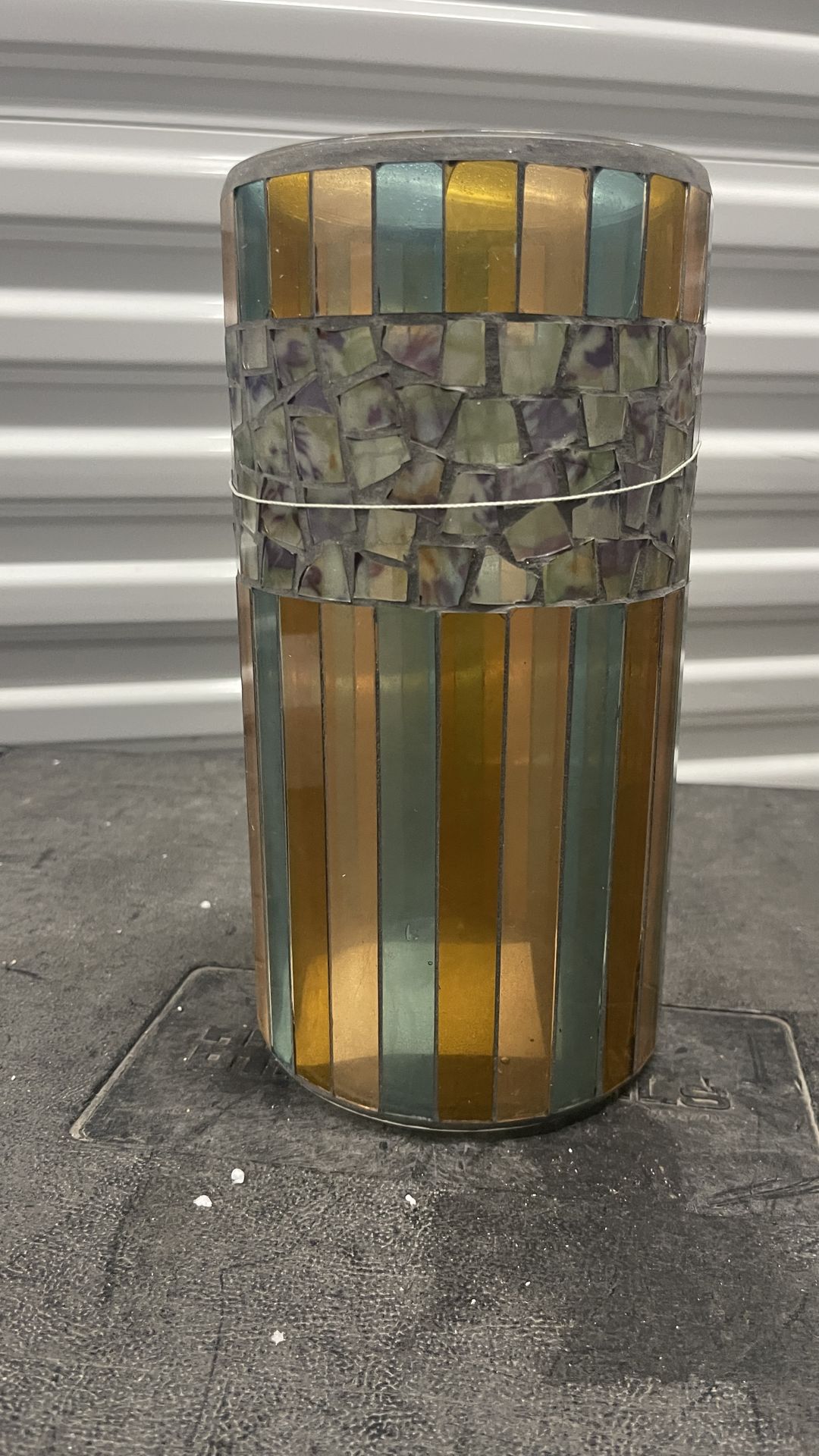 This decorative vase features a mosaic design with iridescent glass tiles. It's cylindrical in shape and displays warm metallic tones. Perfect for holding flowers or as standalone decor! Home interior
