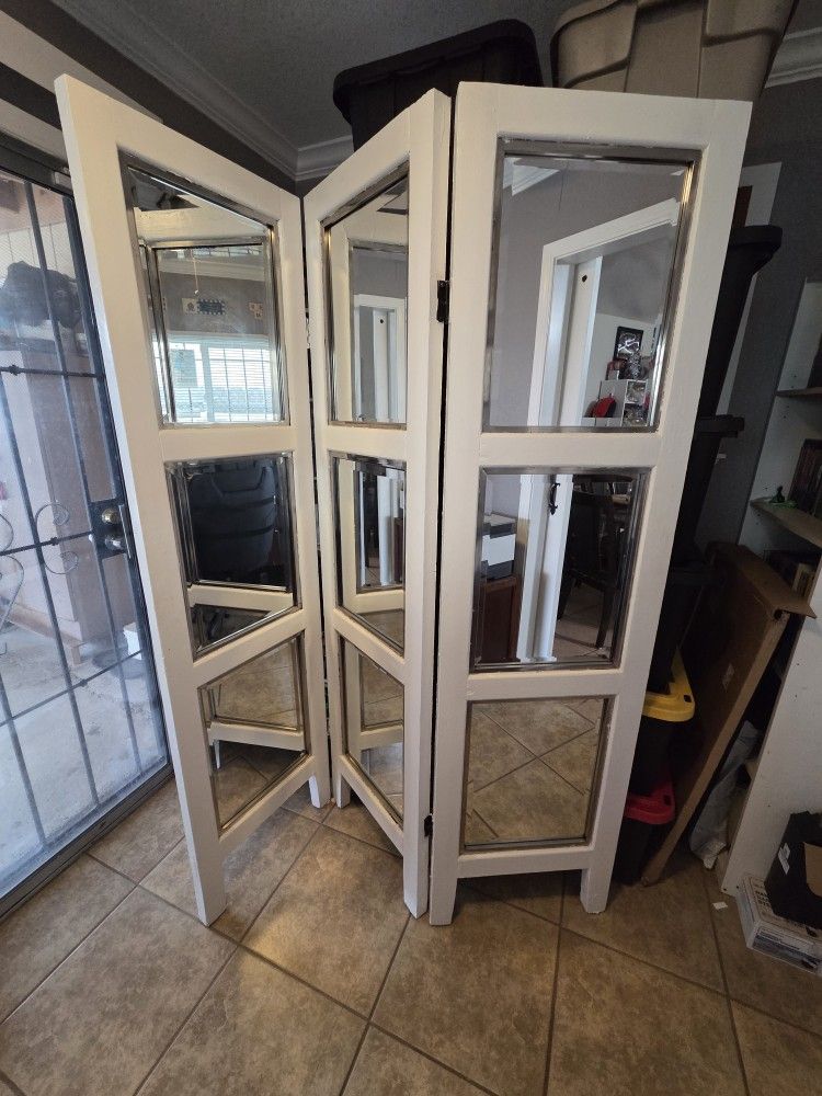 $60 OBO!! SOLID WOOD WHITE 3 PANEL 9 MIRROR ACCORDION STYLE FULL LENGTH 74in H x 60in W, MUST PICK UP VERY HEAVY SOLID WOOD TAKES 2-3 PEOPLE TO TRANSPORT NO DELIVERY! LOCATED NEAR MODESTO HIGH