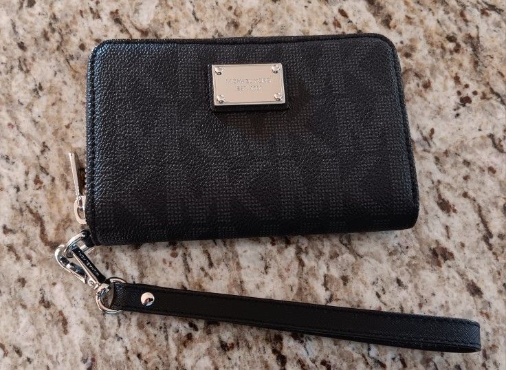 Lightly Used, MK wallet, black, approx 4x6., removable strap.