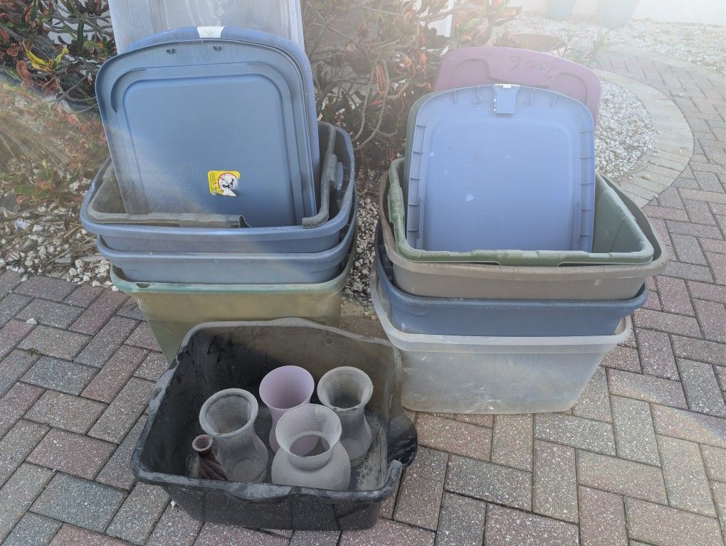 Free storage bins and vases for pickup . They were Sitting in the garage for a while, so its a bit dusty.