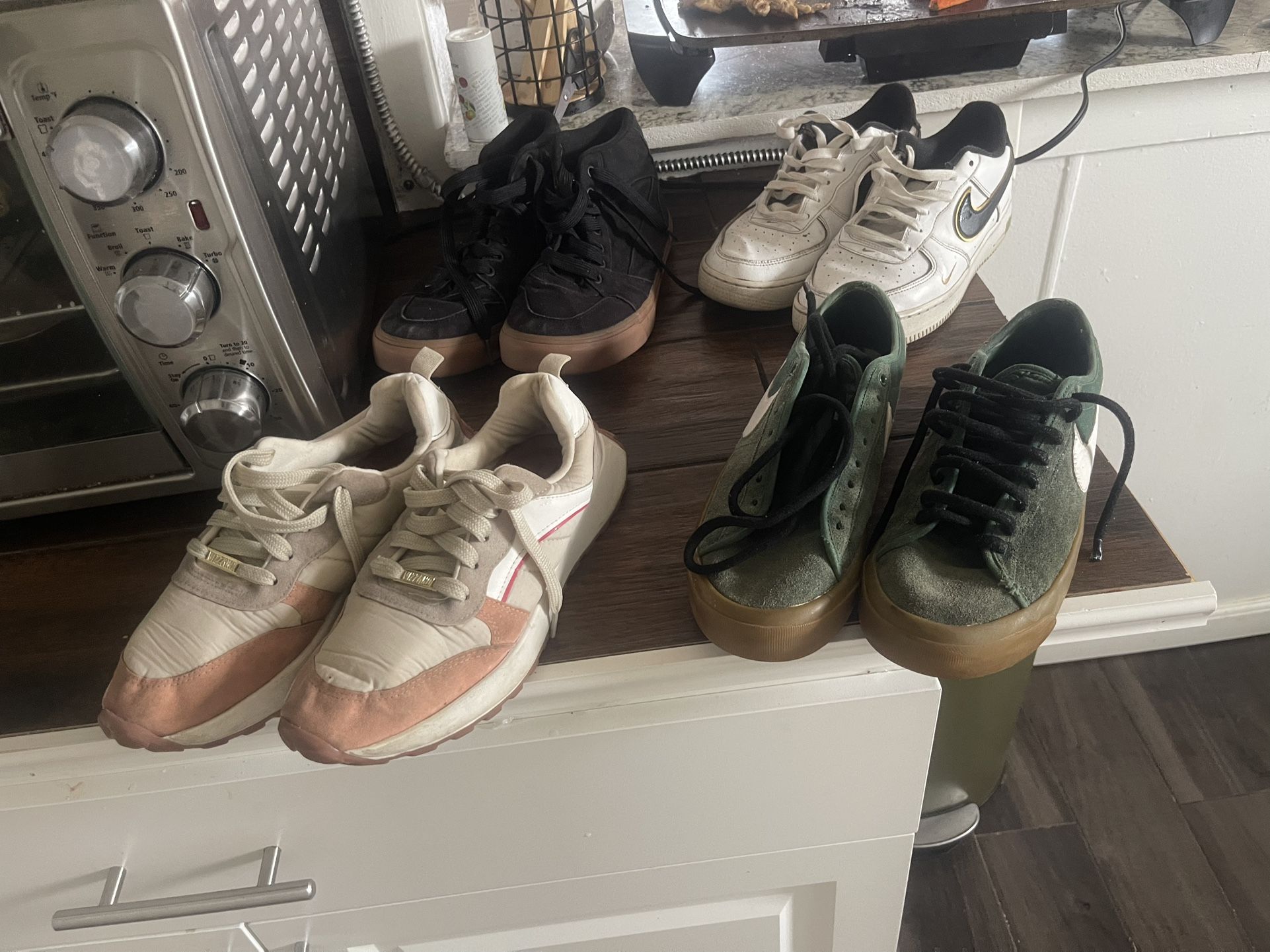 1. Beige/Pink Running Shoes • Lightweight and comfy • Some wear but still functional 2. Black Mid-Top Sneakers (Gum Sole) • Good everyday shoes • Minimal wear on the upper 3. Green Nike Low-Top Sneakers (Gum Sole) • Suede upper • Classic Nike style • Light scuffing from use 4. White Nike Low-Top Sneakers • Black & gold swoosh • Good shape overall, some normal wear