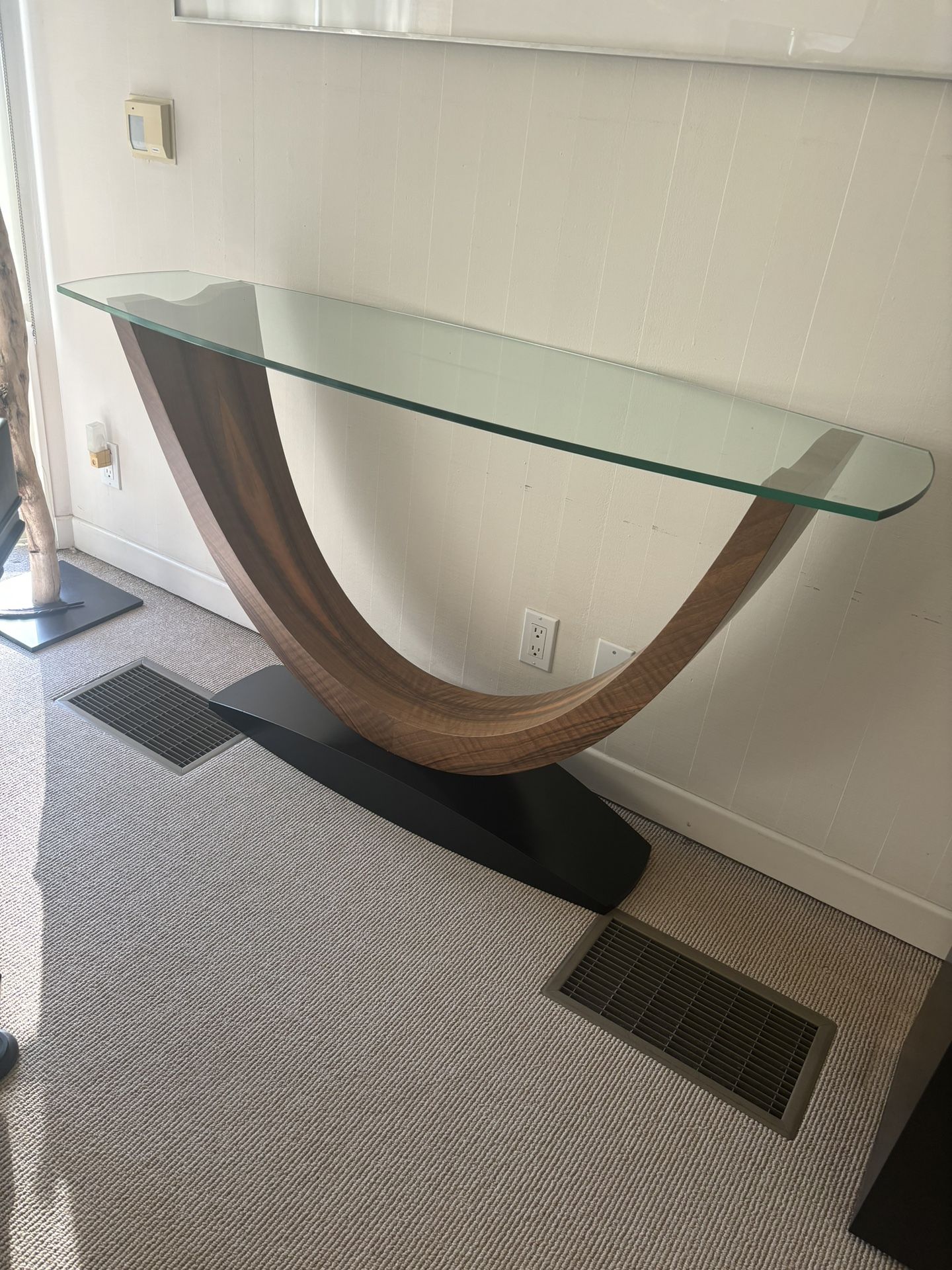 Artisan made walnut console table with glass top. Measurements and info about the artist in photos. Located in Hollywood Hills and in perfect condition! Will need you to load it in your SUV, van or truck. Beautifully handcrafted furniture.