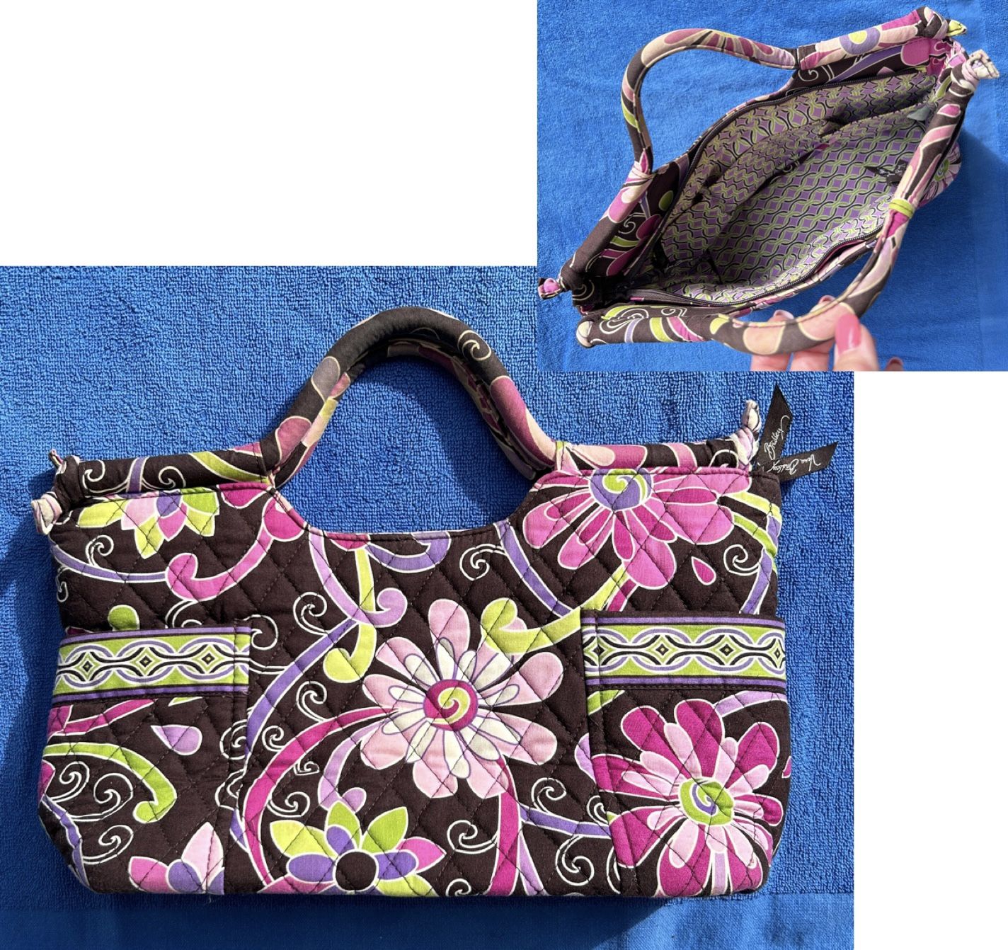 Beautiful pink and brown tones. Two handle purse. Two end pockets.