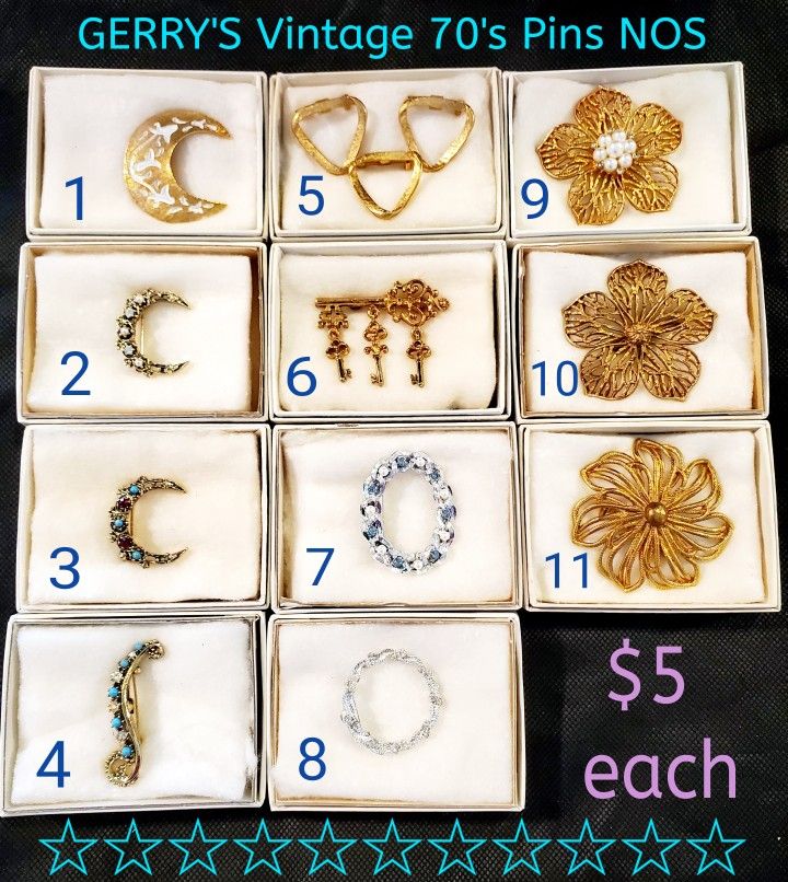 Vintage brooches by Gerry's 1970's 11 to choose from. Claim the number(s). They are $3 each. Great for the holidays. Pick up in Oregon City NOS New Old Stock NIB New In Box Check my listings for more GERRY'S Vintage Brooches