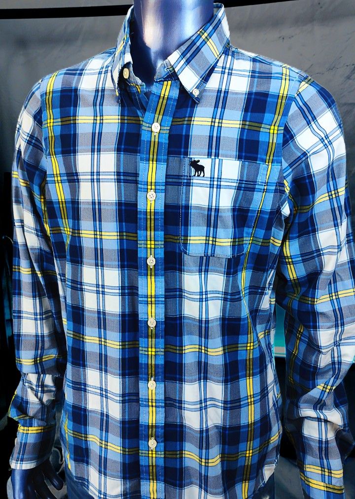 This Abercrombie & Fitch muscle-fit button down brings seriously crisp vibes in a bold blue and yellow plaid. It’s that perfect mix of casual and sharp — easy to wear with jeans or chinos, but polished enough to look intentional instead of thrown together. The cotton feels lightweight and smooth, and the shirt is in excellent shape with no visible flaws, stains, or wear. - Brand: Abercrombie & Fitch (A&F) - Style: Muscle fit long sleeve button-down shirt - Size: Mens XL – approx. 23" chest, 29" length - Color/Pattern: Blue, yellow, white multi plaid - Details: Button-down collar, chest pocket with embroidered moose logo, curved hem - Fabric: 100% cotton woven, lightweight and breathable If you want a plaid that actually pops instead of blending into the closet, this one is legit. The color combo hits hard, the muscle fit keeps it tailored through the torso, and the A&F moose logo seals the deal. Toss it on open over a tee or button it up clean — either way, it’s an easy, epic upgrade to your rotation.