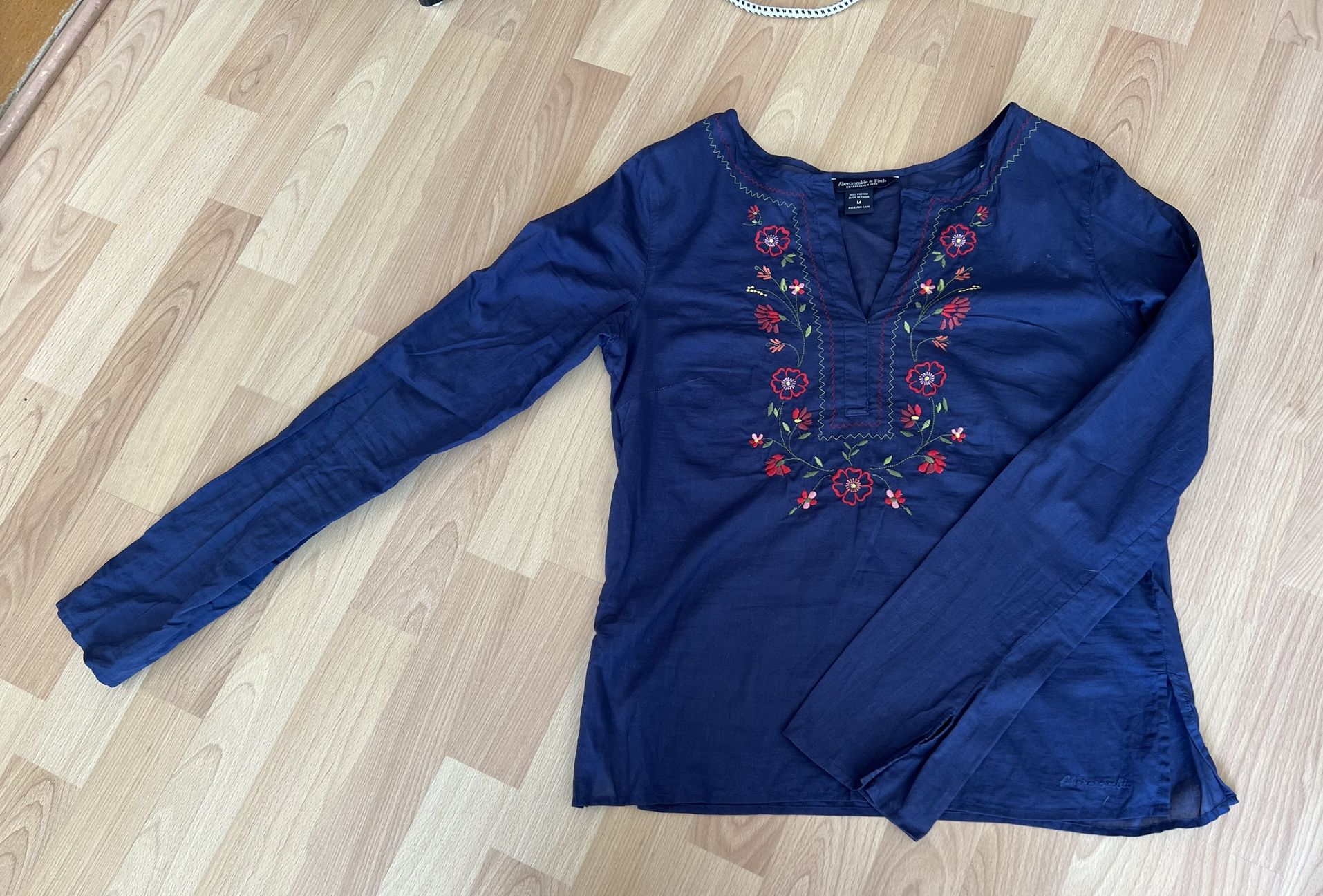 Beautiful blue cotton flowers embroidered shirt. Split on the cuffs as design. Also got same style in white and red Cash only, pick up in Bellevue.