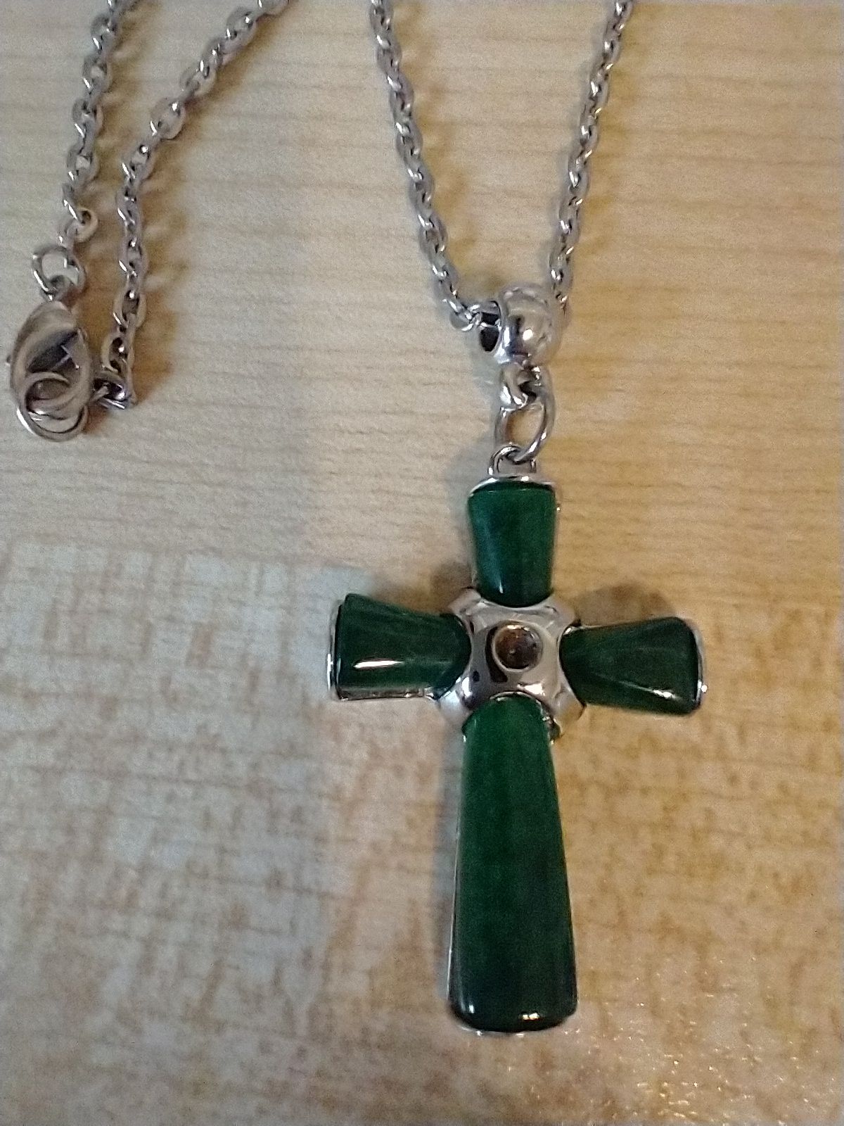 Dark jade green cross with chain. Cross is 1-3/8" H x 7/8" W. Chain is 24" long. All listed items are available Pick up in front of Fresno Police dept Northwest parking lot.