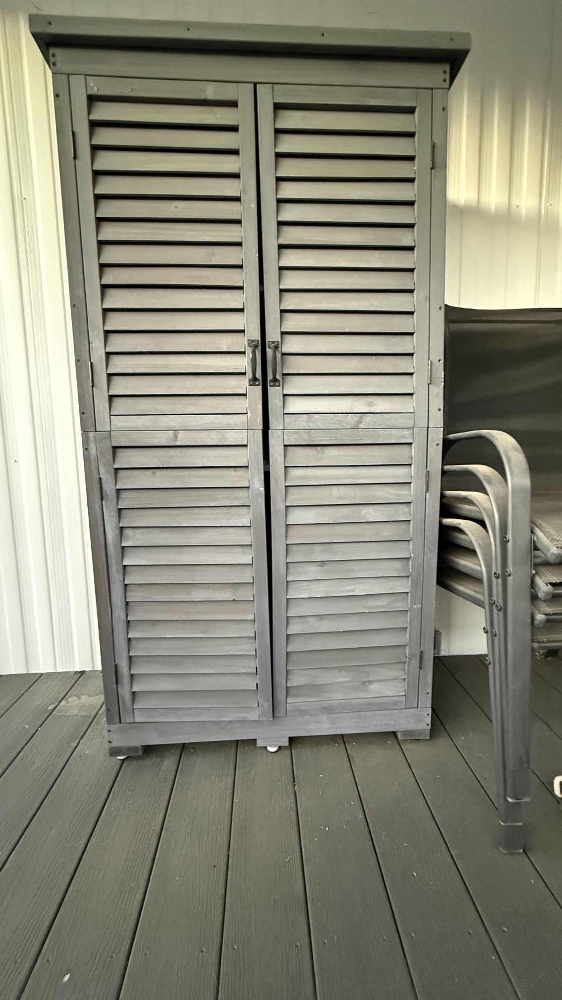 Narrow storage cabinet, Garden storage shed, to use outdoors or in a garage. 63” tall; 16.5” deep; 32” wide.