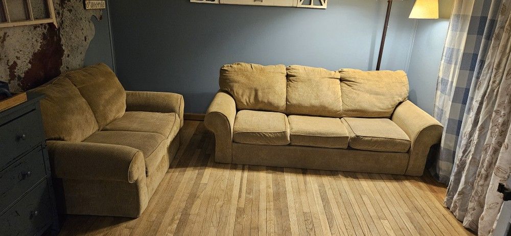 Its an older living room set still alot of life left save some money buying these. Only stains are underneath cushions on couch. Ask about delivery $150