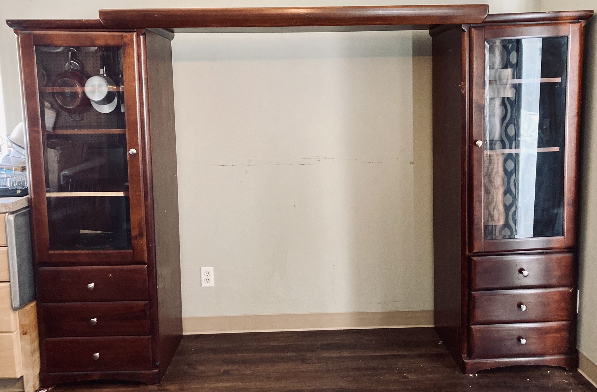Cherry wood solid oak entertainment center. Comes in 3 large heavy pieces. Lights up in the top shelving area on each pillar. Purchased from Ashley furniture years ago for $2,000 and just time to get rid of it as we need to down size our apartment.