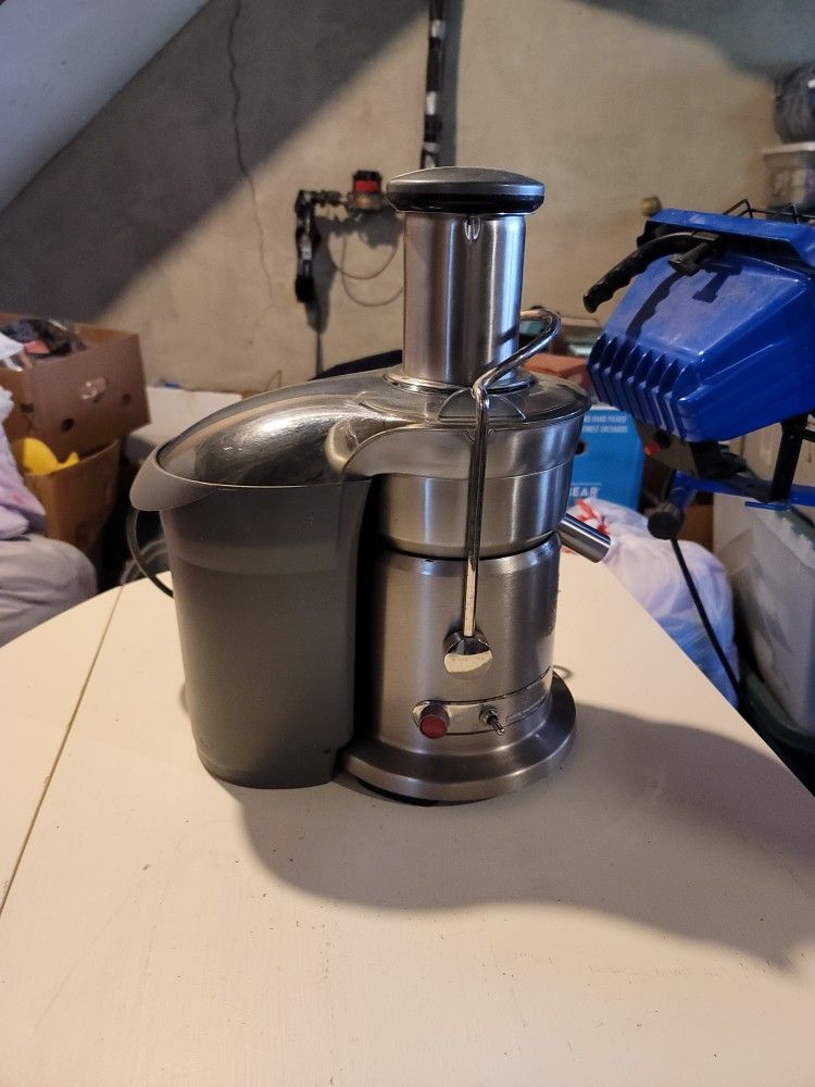 Very nice and in good working order Breville 800JEXL/B model Juice Fountain Elite juicer. Plastic jug that came with broke a long time ago but i would use a regular pitcher in its place. Kept clean but dusty from sitting and non use. Brushed metal finish.