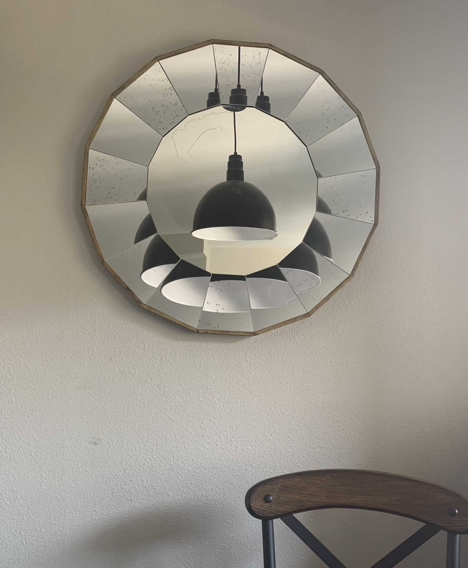 This is a well made mirror with a distressed wood frame. The back of the mirror is a sturdy wood panel with a hanging wire. The glass has had a vintage finish applied which you should be able to see in the images. It’s a nice high quality piece. Please let me know of you have any questions or would like additional photos Roughly 32” diameter and 1.6” inches deep