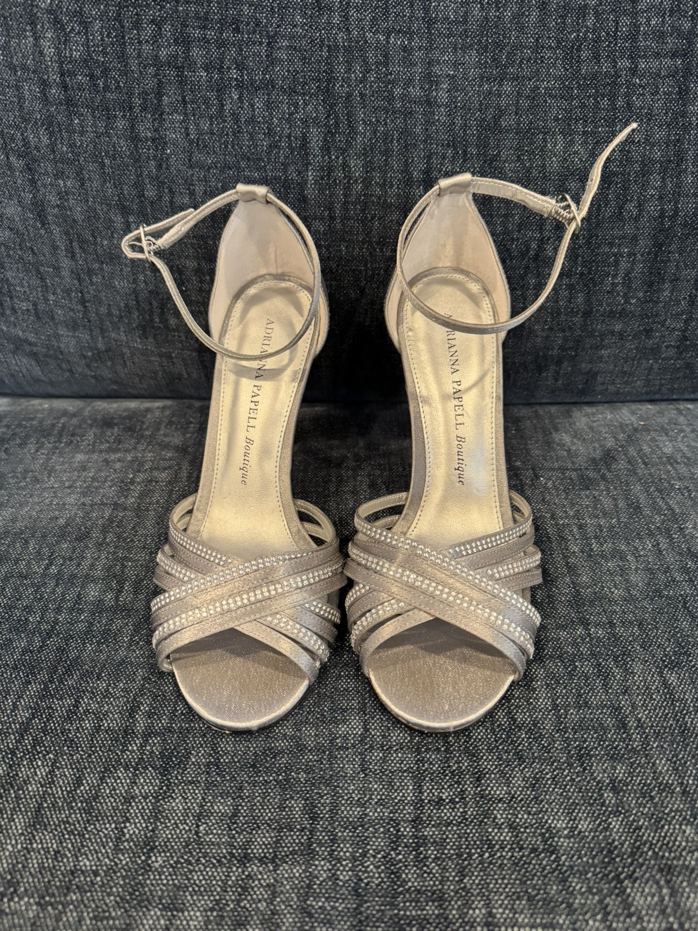 Silver with rhinestone accents. Size 7. Used only once. Comfy & beautiful. Heel is 3”. Ankle strap closure. Pickup in St. Charles. East side