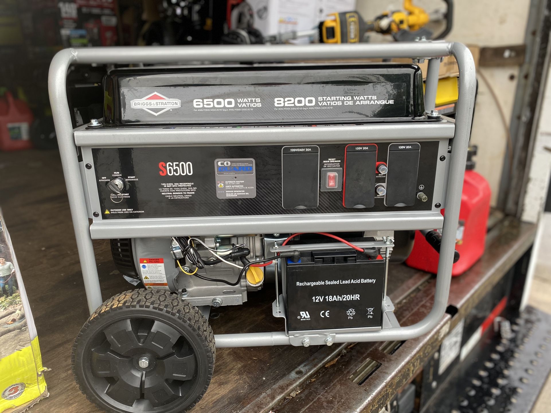 Briggs & Stratton s6500 electric start 8200 starting watts 6500 running watts 4 x 120volts 20amp outlets 1 x 120/240volt 30amp outlet 9 hours operation at half load