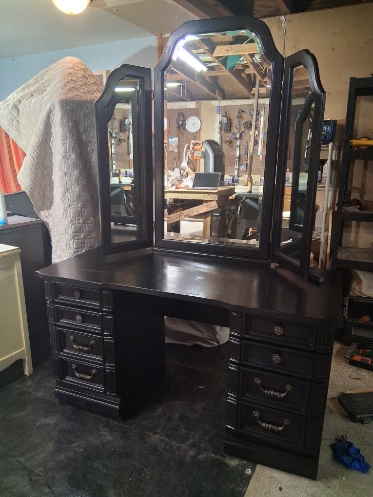 I’ve put a lot of work into this piece to give it a fresh look. I fully sanded and painted it in a sleek black finish. It’s not factory perfect, but it is a massive improvement over how it started and looks great in person. Dimensions: Dresser: 54" wide x 24" deep x 30" tall Mirror: 52.25" wide x 46" tall Total Height: 76" from the floor Condition: All drawers are in 100% perfect working order. They slide smoothly with no issues and have all original rails and hardware. Availability: If this doesn’t sell in the next few days, I’ll be taking the listing down and relisting it with a matching chair for a higher price. Grab it now if you just want the vanity! Pickup & Delivery: Pickup: Near 75th and Keystone. $50 Delivery: If you can help me unload it at your place. $100 Delivery: If I need to bring someone along to help me move it.