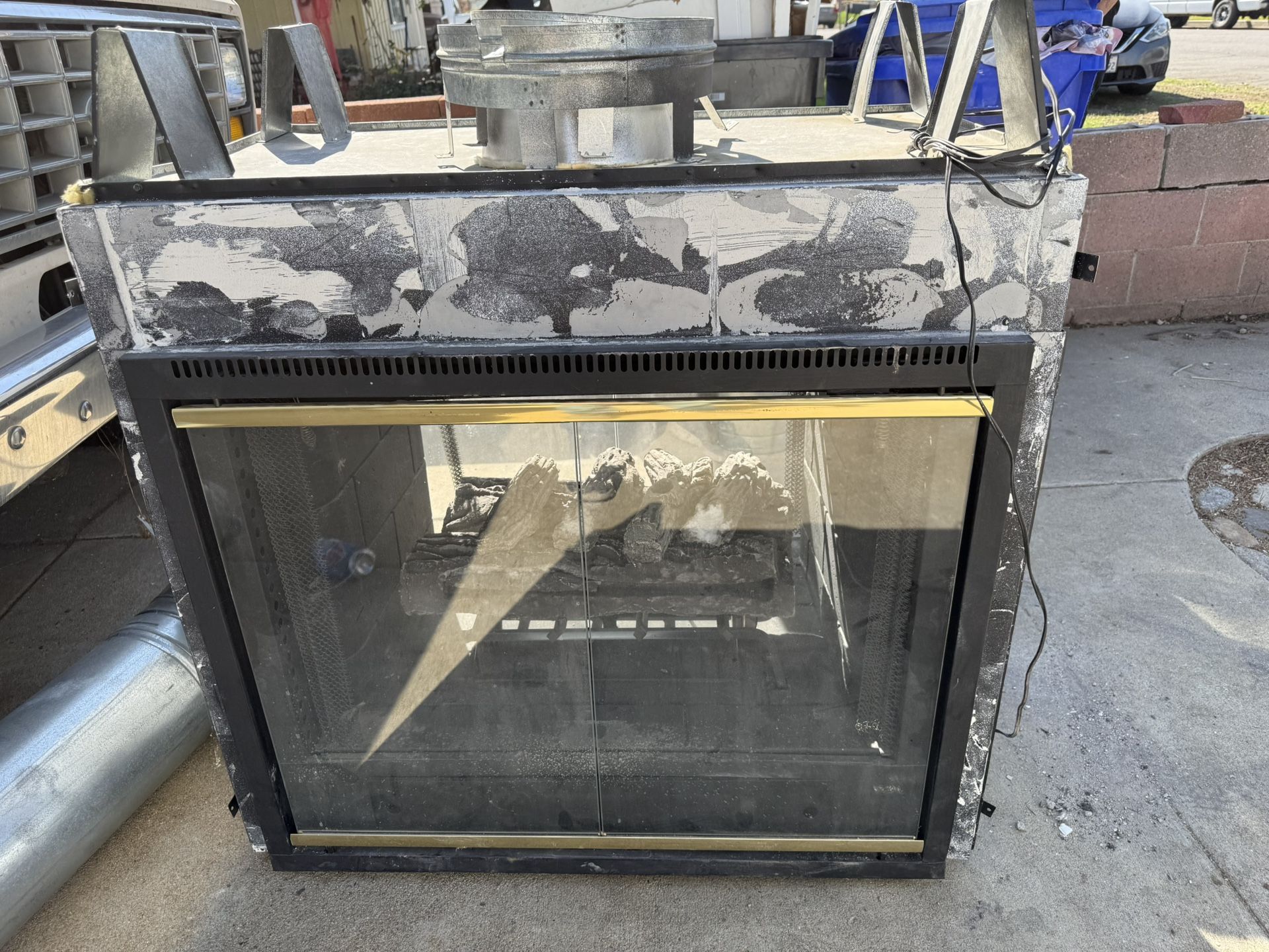 Double Sided Gas Fireplace This is a gas burning fireplace. It’s double-sided so it’s see-through. It works great. Everything‘s good on. It comes with all the accessories that you see and deducting. The cosmetic is just from the old Tile that was there. It will be covered up upon a new install.