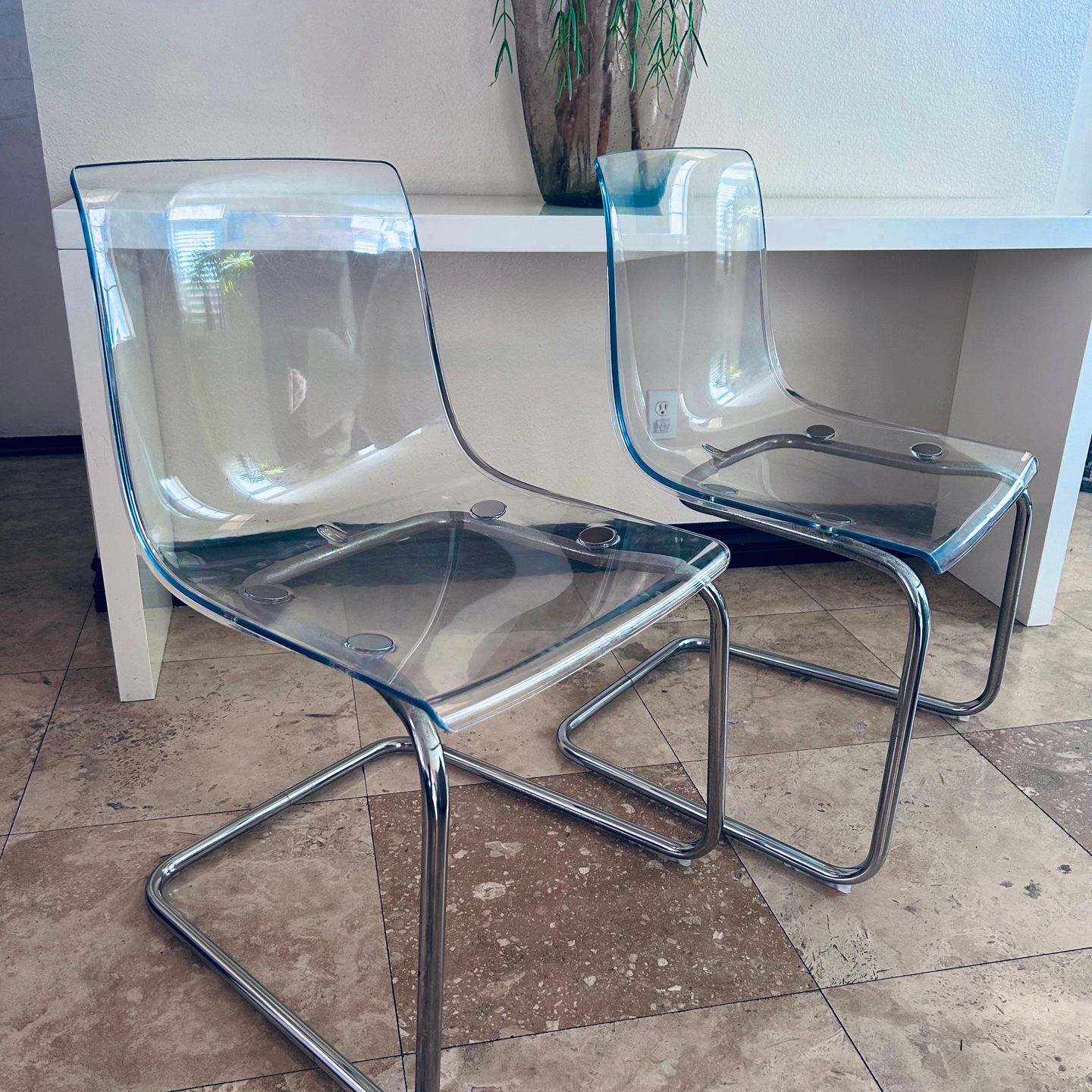 Modern set of 2 clear chairs. Has cool chrome cantilever bases. Super chic and comfy. Great for a dining room, office, or just as accent chairs.
