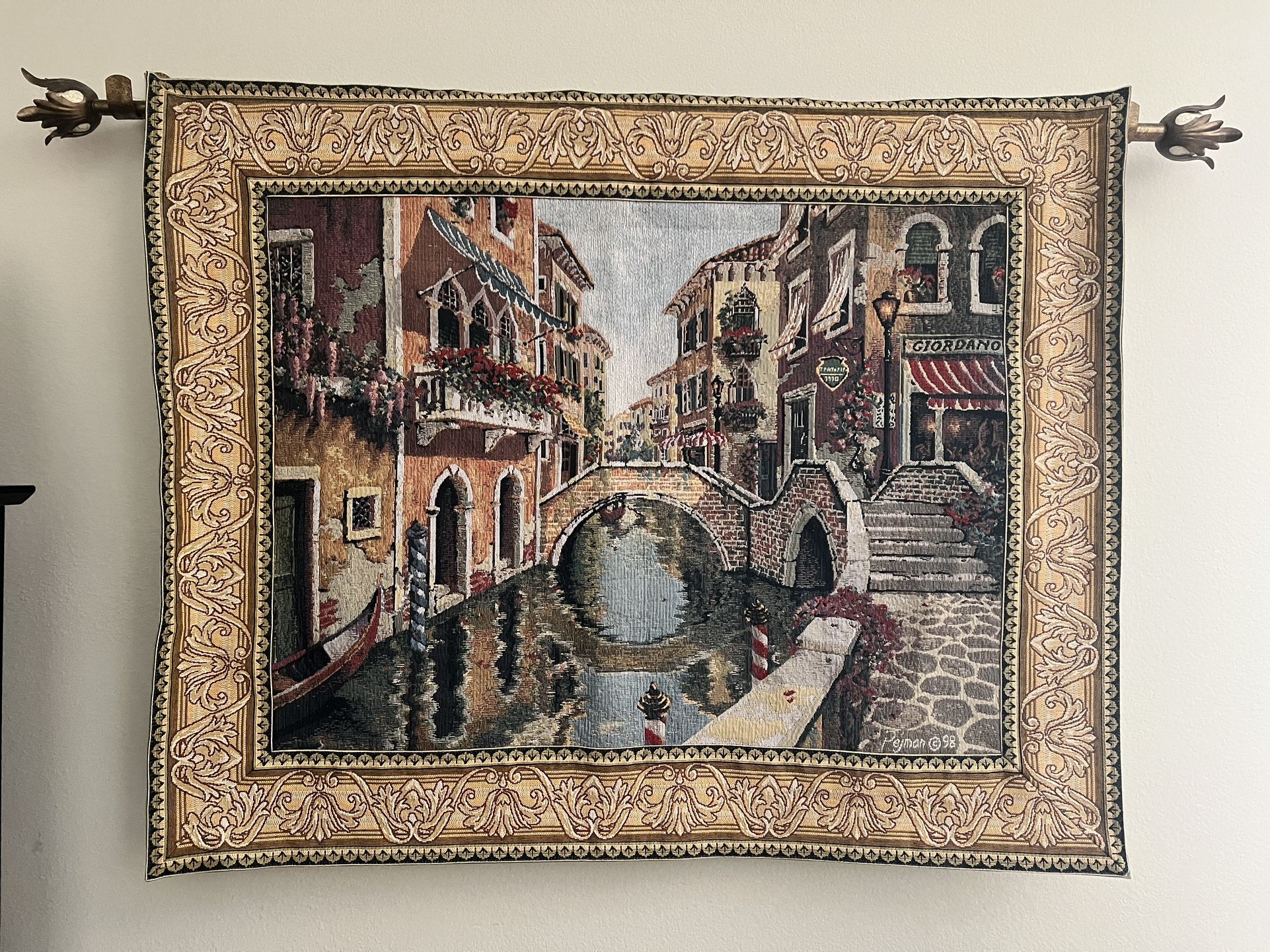 Italian Wall Tapestry. Signed by the artist. Lovers Bridge of Sighs in Venice. Rich warm colors. Comes with beautiful decorative hanging rod. 33” long x 40” wide. Perfect condition. Nice holiday gift