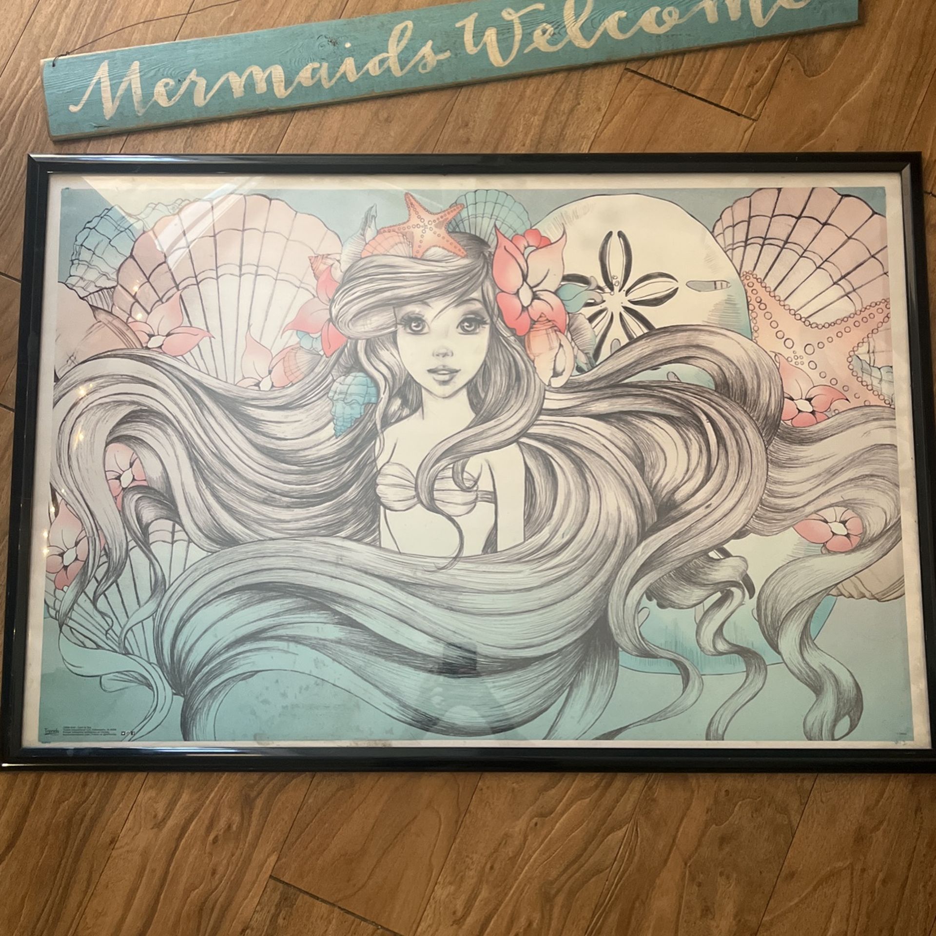 Wood mermaids welcome sign and 25” x 37” framed mermaid picture.