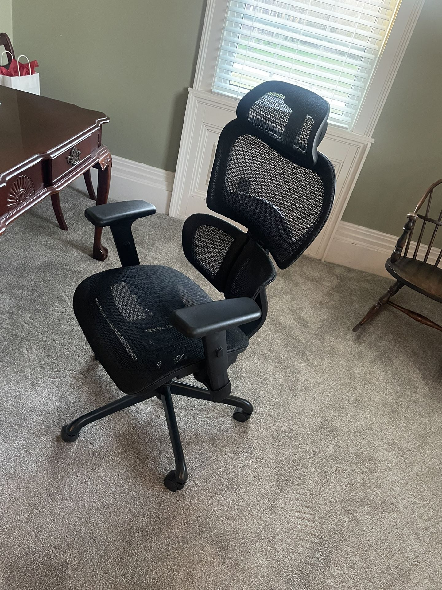 Ergonomic mesh office chair. Great condition hardly ever used. It has adjustable an head rest, adjustable arm rests, and adjustable seat height with a lean back locking mechanism and lumbar support.