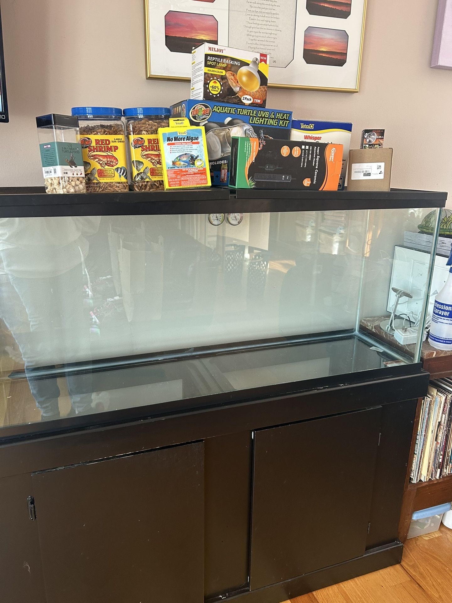Good 60-gallon aquarium with black stand. We also have half a canister of 4 oz 3 in 1 meat turtle food, 2 10 oz canisters of large red shrimp (one unopened and one slightly used), a brand new aquatic turtle uvb & heat lighting kit, 8 tetra whisper filter cartridges, 9 uva&uvb lightbulbs, 12 no more algae tabs, a new square ceramic aquarium heater. $250 OBO
