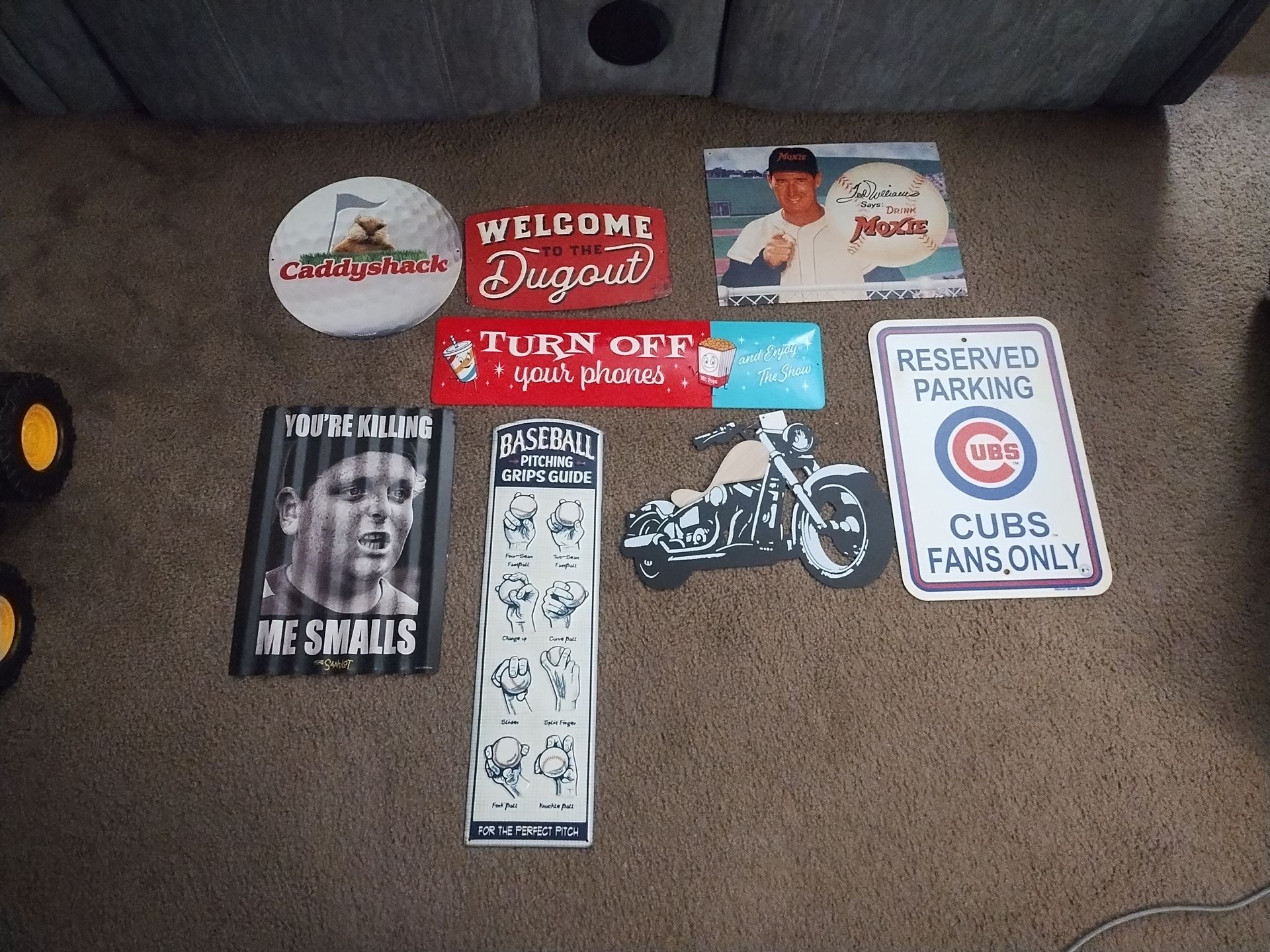 Caddyshack, welcome to the dugout, turn off your phones and enjoy the show, Ted Williams says drink moxie, reserve parking Cubs fans only, motorcycle sign, baseball pitching grips guide, you're killing me smalls, $15 Each or make offer on all or ask for each price of individual