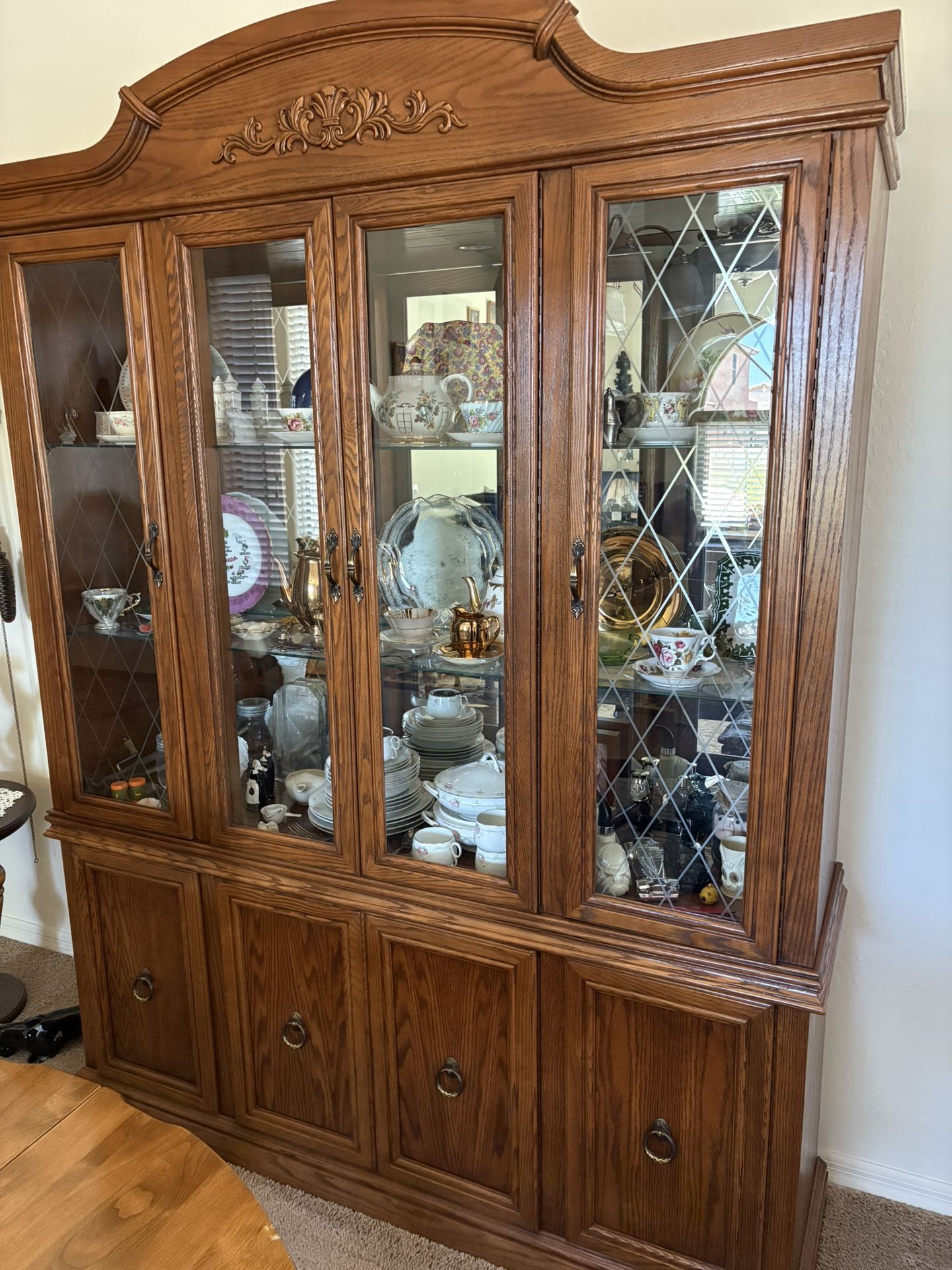 Solid wood china cabinet made in Canada. Excellent condition. Size is 62” wide, 83” tall, 16” deep. Has a pull out drawer in the bottom middle section, shelves in the two outer bottom sections, mirrors in the back of the top section, and a light in the top section. Items inside are not included. Cash only.
