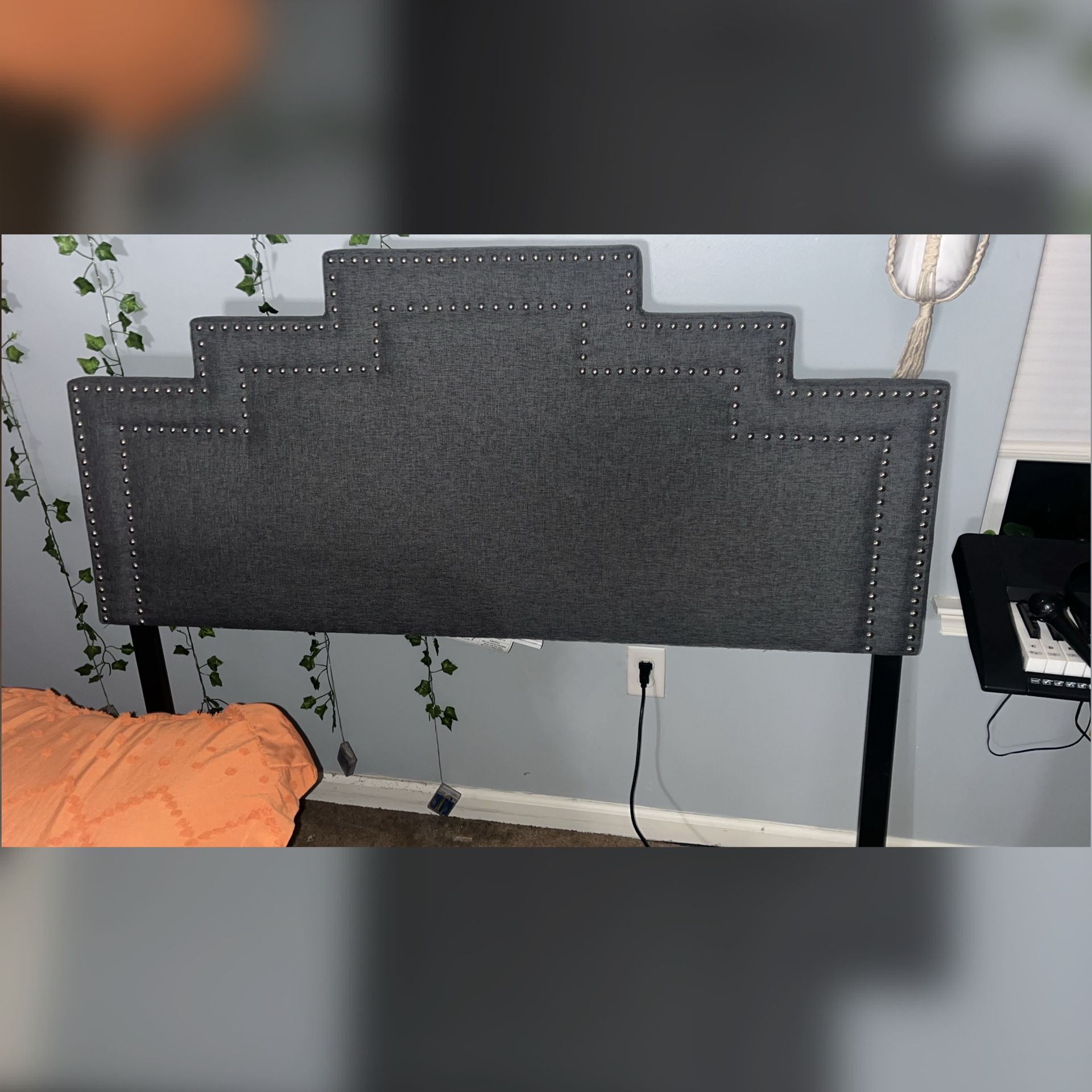 Modern and Contemporary gray Headboard for a Full size bed. Dark grey fabric upholstery Wood post in wenge finishing Button-tufting design Sculptural shaped style $70 OBO cash only