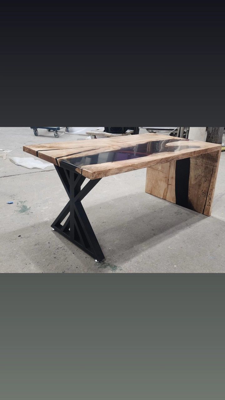Beautiful coffee table, dark finish, maple leaf edge, natural color, with one leg at a 45-degree angle and another in metal! You can make me an offer and we can reach a deal! Dimensions: (23"D x 41.5"W x 19.5"H) Free delivery in Maryland!!