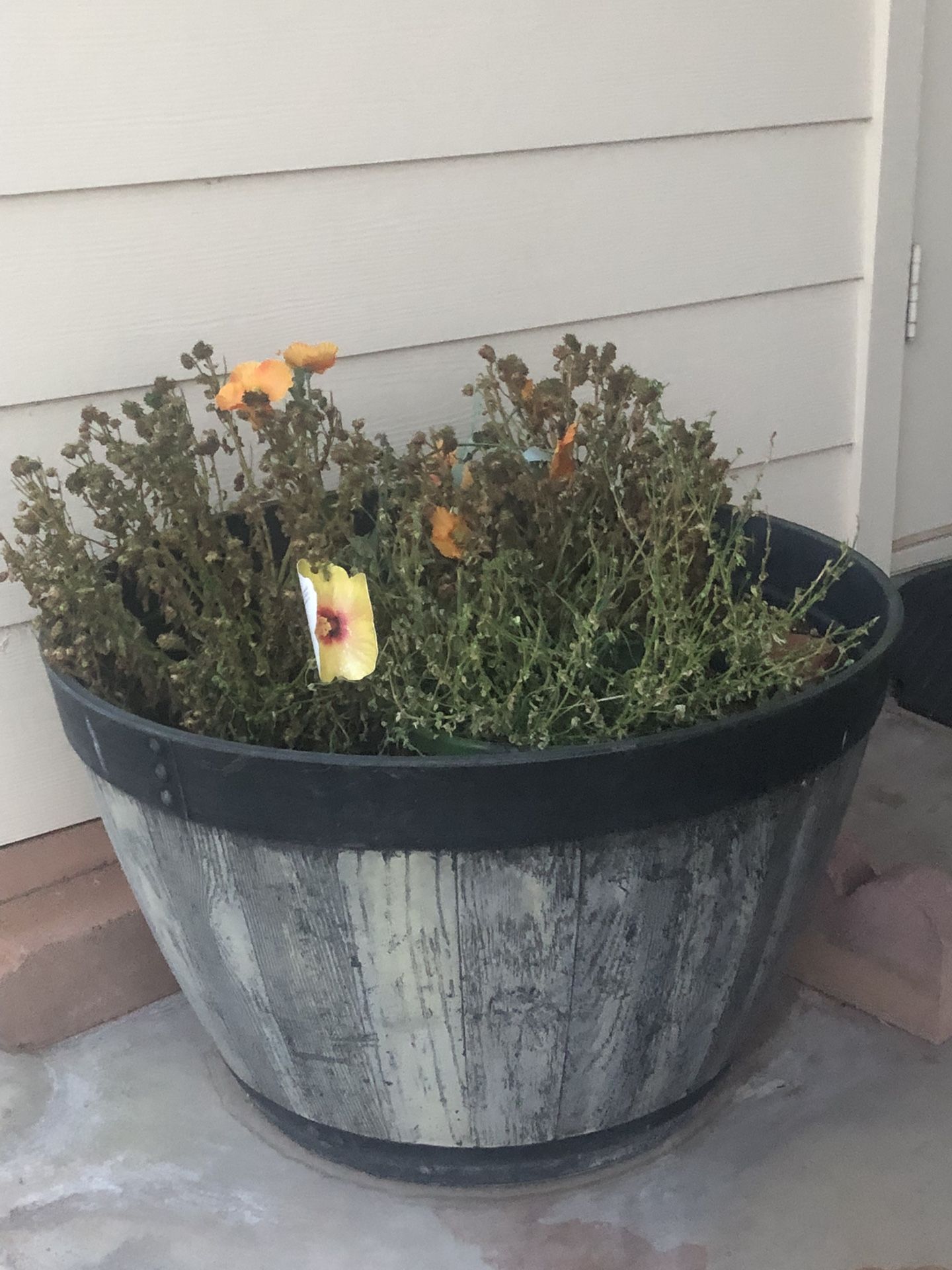 Gray Barrel Type Planter Full Of Potting Soil And “plant”