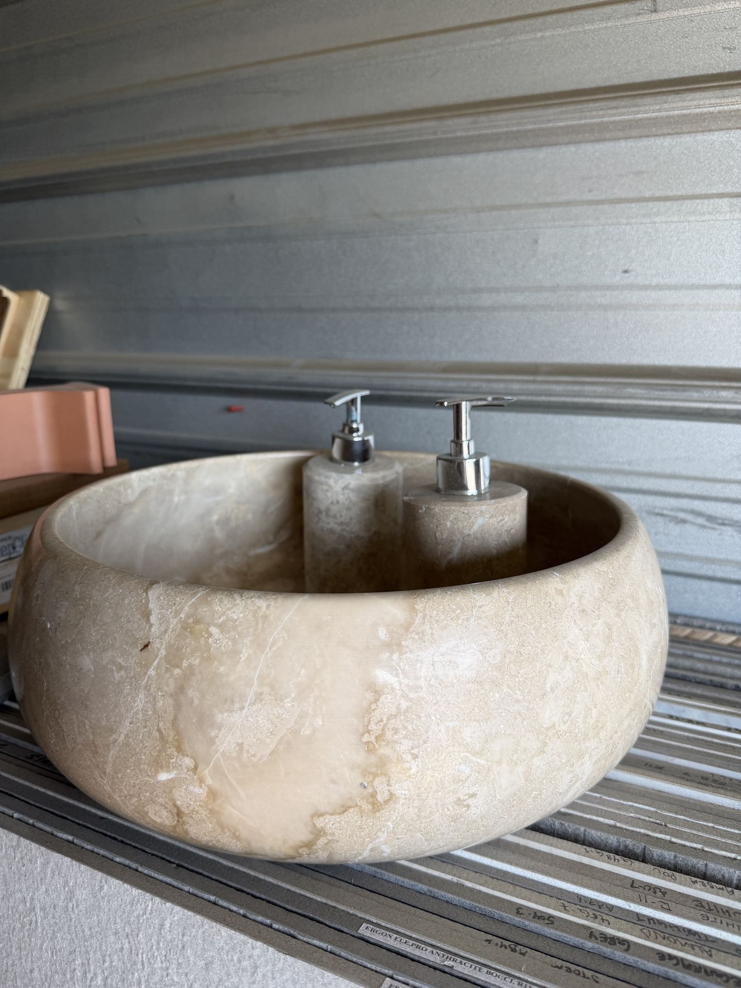 Marble bathroom vanity with shampoo bottle included