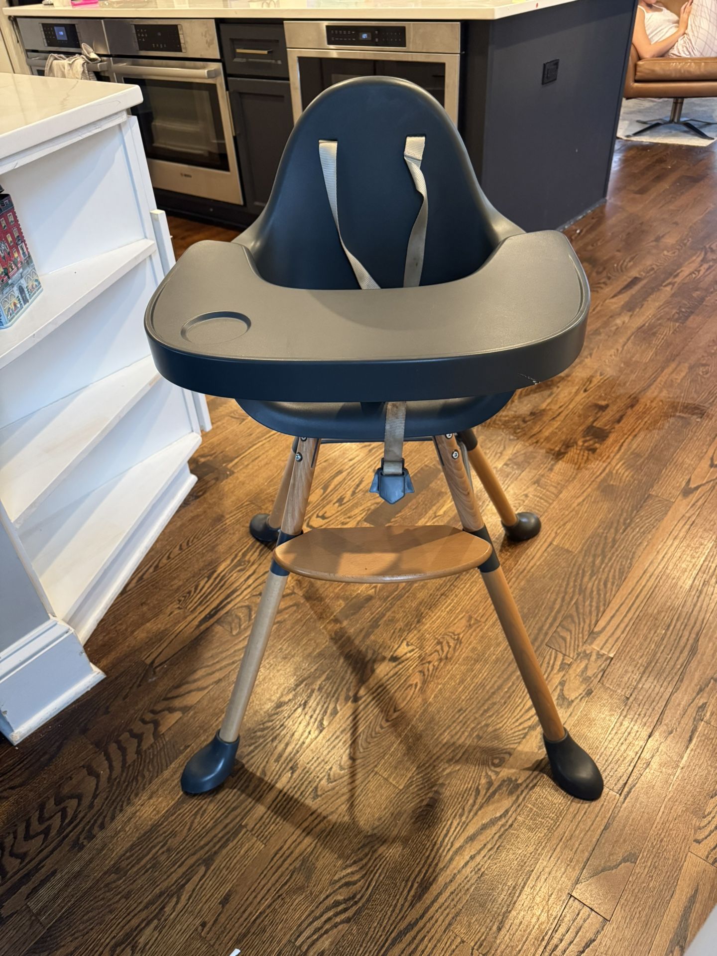 Childhome - High chair Evolu naturel anthracite This trendy 2-in-1 high chair can be adjusted to 2 table heights: a standard 75 cm dining table and a 50 cm children's table. An extra-long leg set is available as an option to adjust the height of the high chair to a 90 cm kitchen island. Thanks to the easy assembly, changing the height is very simple. The child seat can also be used from birth in combination with the newborn seat. The depth-adjustable dining table is available as an option, so your child has their own table. The Evolu high chair has a 5-point seat belt and a removable roll bar to keep your child safe.