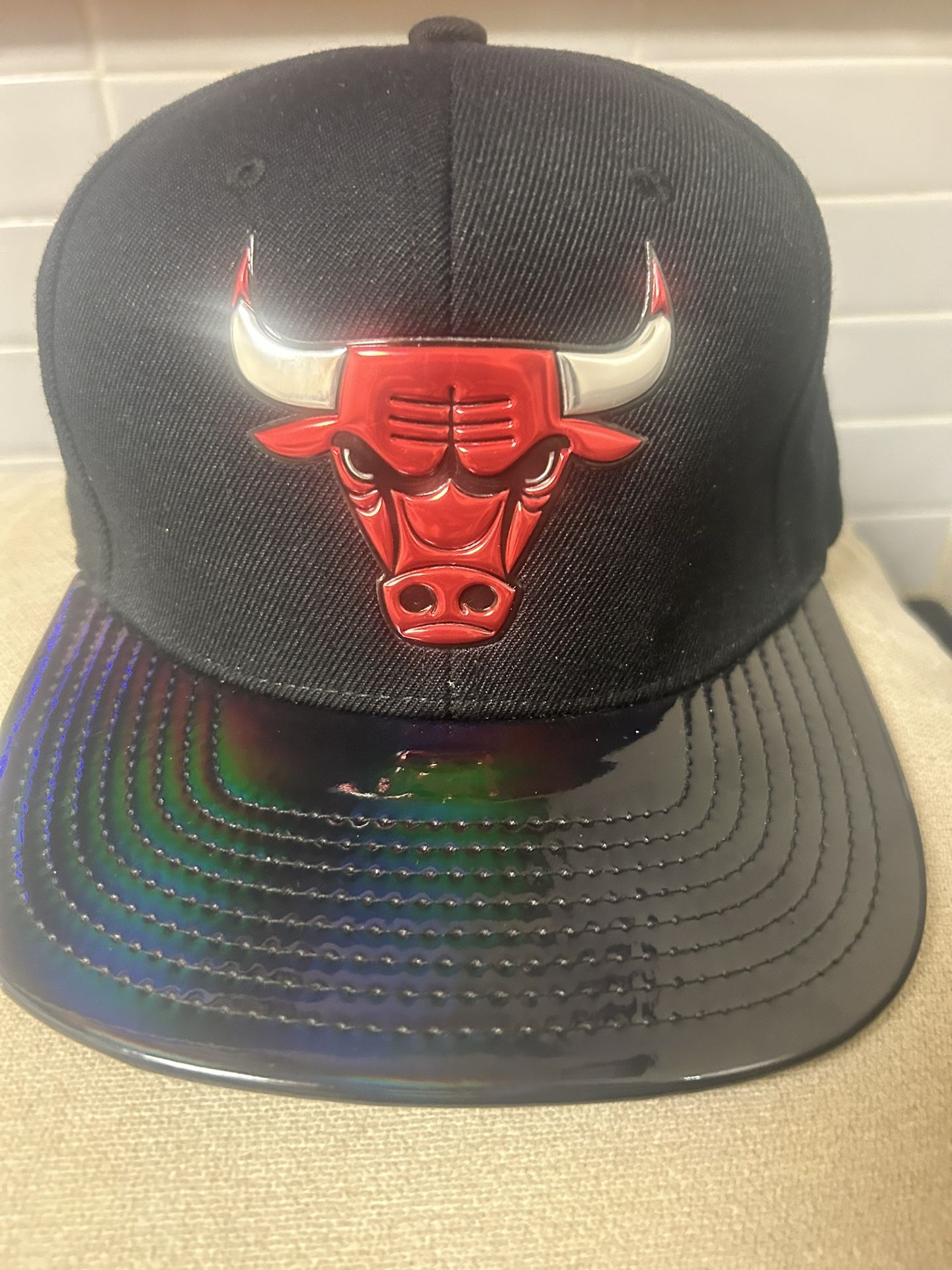 Mitchell & Ness Chicago Bulls Snapback Hat w/Black Patent Leather Brim Black, Red & White One Size
